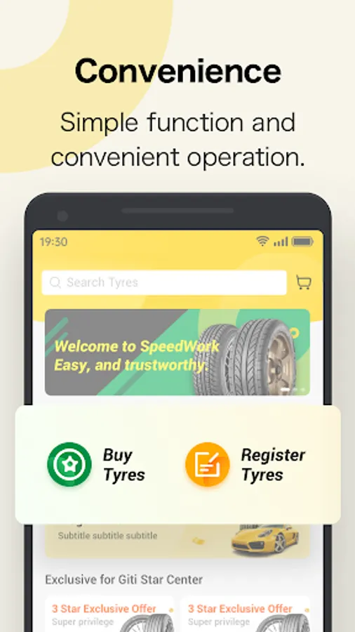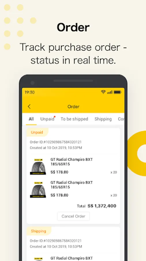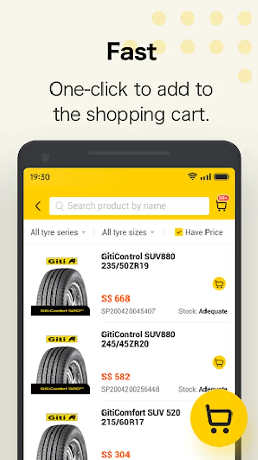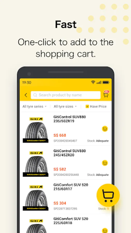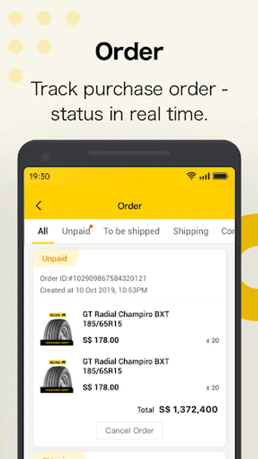 Purchase tires by quickly selecting tire sizes, providing a convenient customer purchasing experience, and tracking the entire process of order procurement, delivery, and receiving processes.