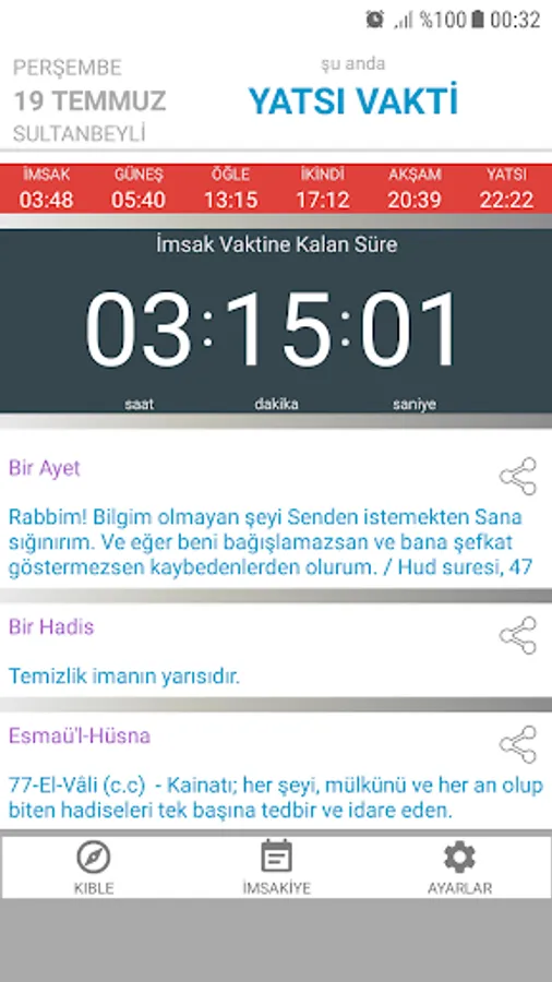 On the main screen, there are hadiths, verses and examples from Esmaü'l-Husna. If you wish, you can easily share them by tapping the share icons next to them. Again, on the main screen, information about the remaining times for important religious days is given.