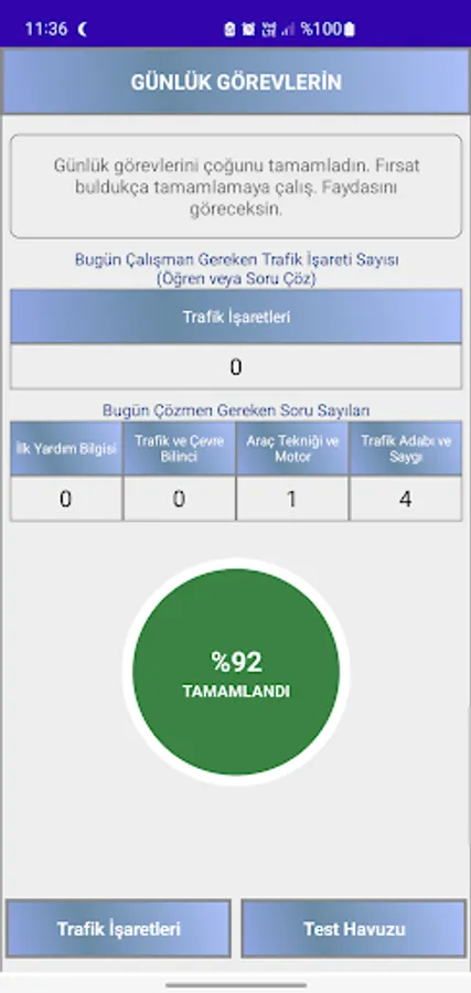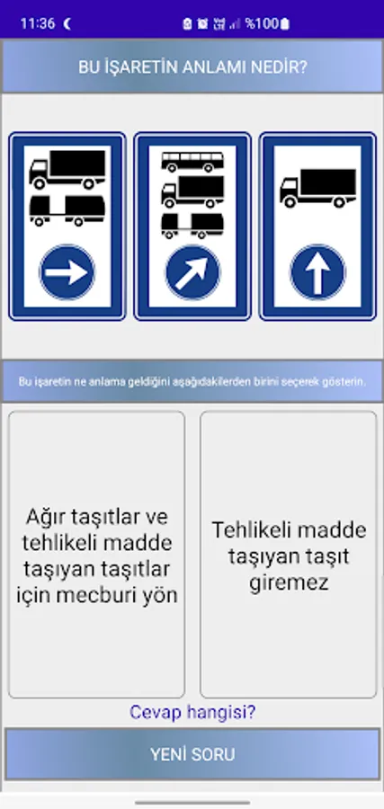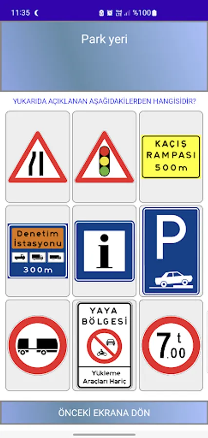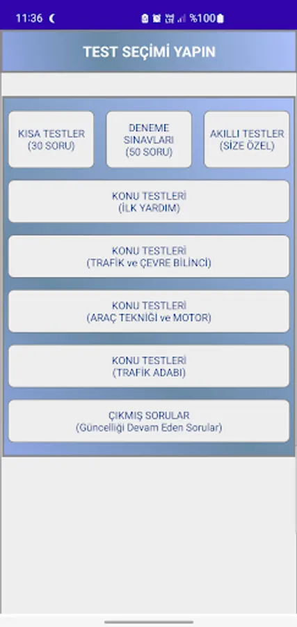 In our application, there are subject tests and general practice exams that you can create as a mix from the questions that have come out before, and traffic signs and signs sections presented with different options.