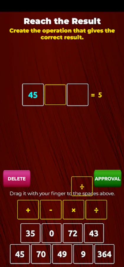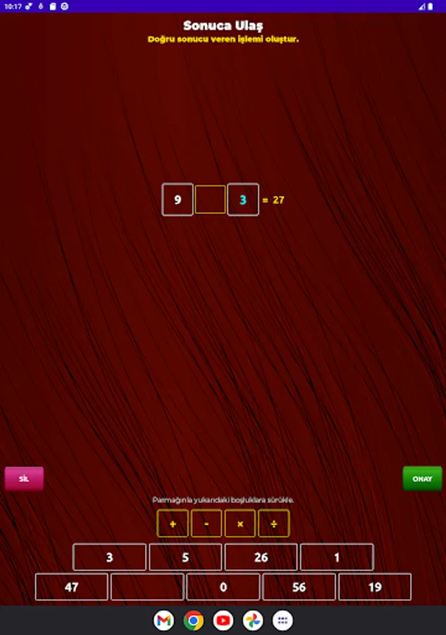 In the conclusion section, you will be given the result of the process. Try to figure out what operations need to be done with which numbers to achieve this result. In this section, sometimes the operation or one of the numbers is given as a constant. In this way, your mind is prevented from always focusing on the same processes. Hold the numbers and four operation symbols given at the bottom of the screen with your finger and drop them into the appropriate boxes above.
