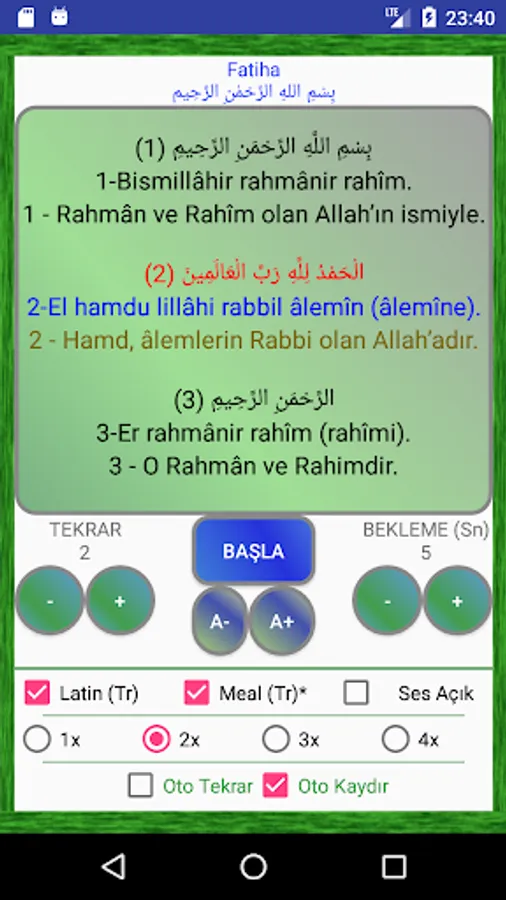 You can set how many times you want each sentence to repeat and how many seconds to wait between repetitions, right on that screen. Even when you start listening to the surah or prayer, you can change the number of repetitions and waiting time settings. We recommend that you set an appropriate waiting time for you to repeat the verse (or sentence) you are listening to. When you return to the previous screen with the back button, the waiting time, number of repetitions and font size are saved on your device and your settings are ready without re-adjusting each time.