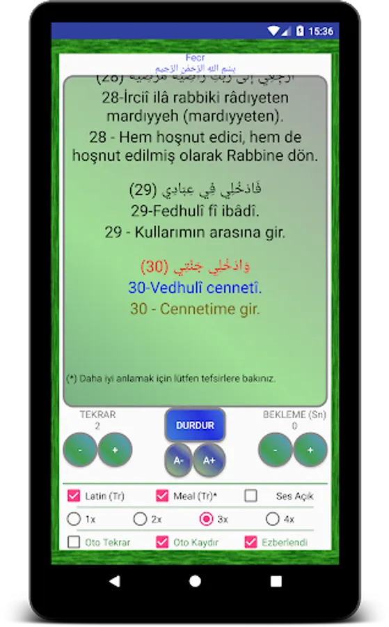 You can set how many times you want each verse to repeat and how many seconds to wait in between, right on that screen. Even when you start listening to the surahs, you can change the number of repetitions and cooldown settings. We recommend that you set a suitable waiting time for you to repeat the verse you listened to. When you return to the previous screen with the back button, the waiting time, number of repetitions and font size will be saved on your device and your settings will be ready without re-adjusting each time.