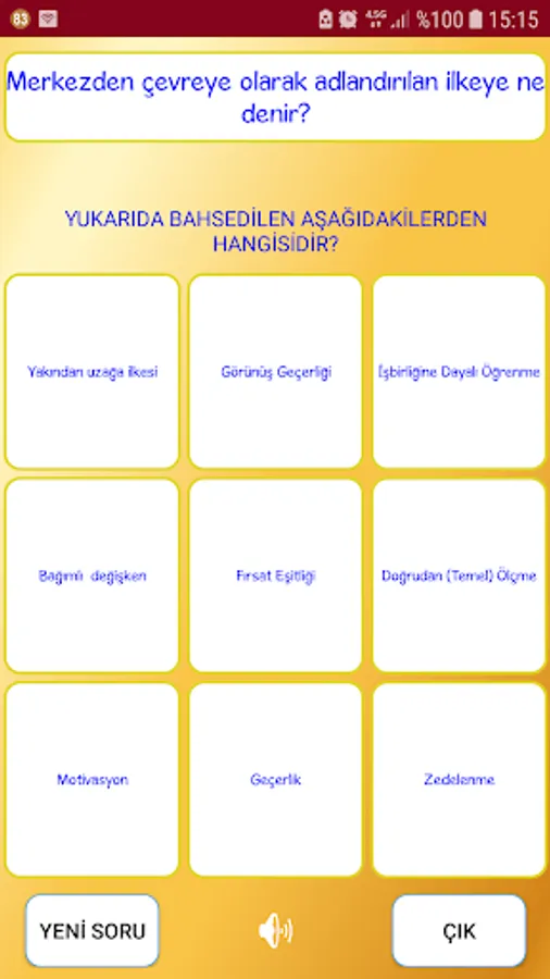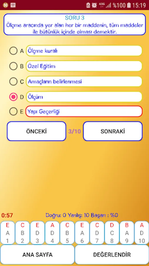In the test section of our application, 10 random questions are asked based on the questions on the topics you choose. At the end of the test, you can easily see your correct and incorrect information by evaluating the test, and you can see the correct answers to the wrong answers by going back and forth between the questions. (Explanation: The choices in the test section are taken randomly from other questions. Therefore, you may encounter options that are not suitable for general test techniques. Since our aim here is to reinforce your knowledge with the multiple-choice question technique, we ask you not to consider the inconsistency in the options. )