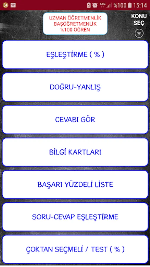 Expert Teacher General Practice Exams, which are prepared in accordance with general test techniques, have been added to our application. The information about the tests you have solved before is kept in memory. This way you can track your progress.