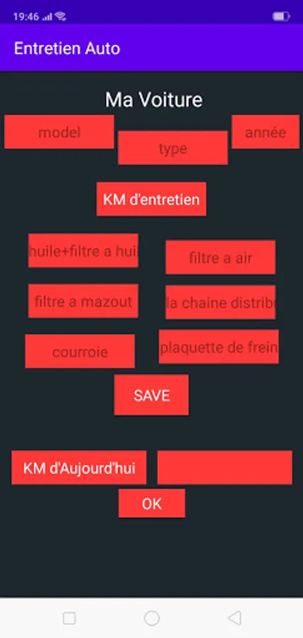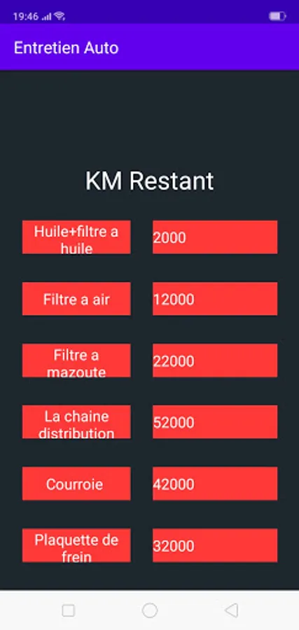 This car maintenance application allows the car driver to know the remaining mileage after having done the maintenance (oil change, parts exchange ... etc) and also a reminder with an alarm for the dates of the check of the papers of the vehicle. car (insurance, technical control)