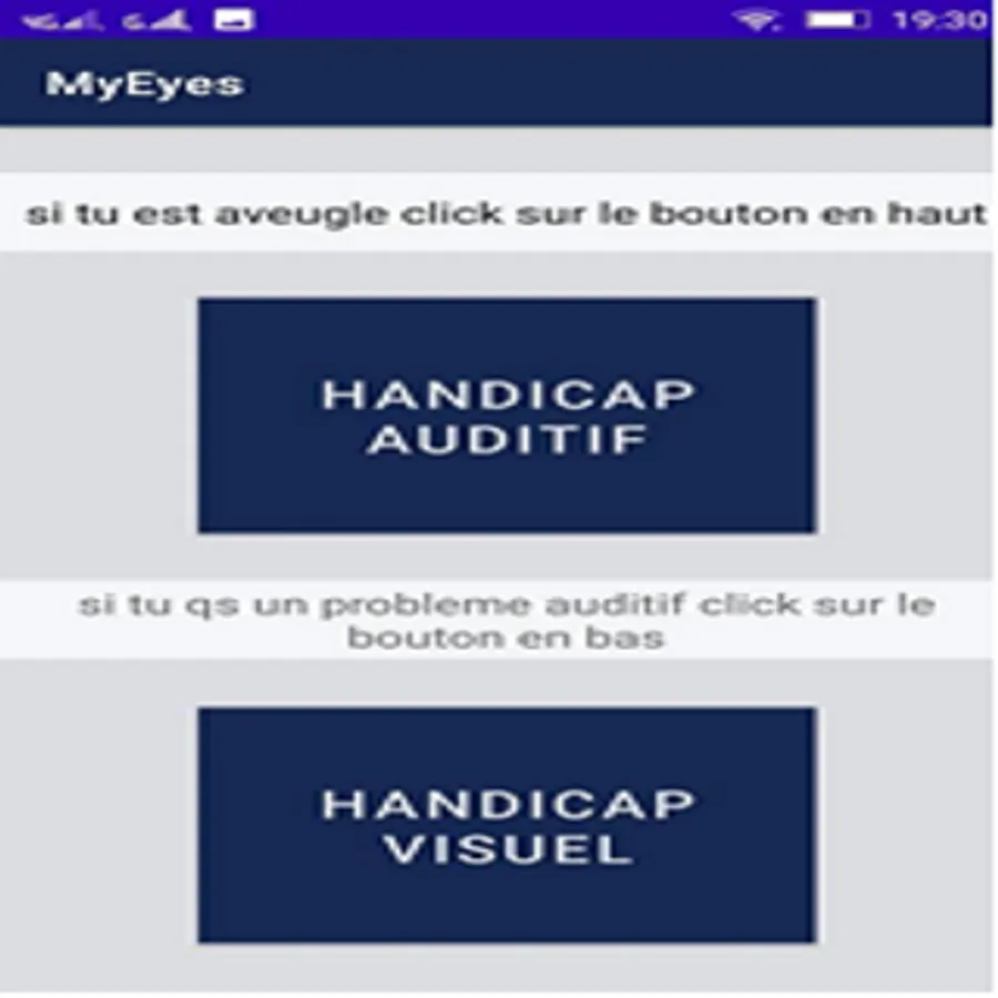 MyEyes is an easy to use application for the visually impaired and hearing impaired, this app contains a camera to read all types of texts and also a voice command is used to transform voice into writing.