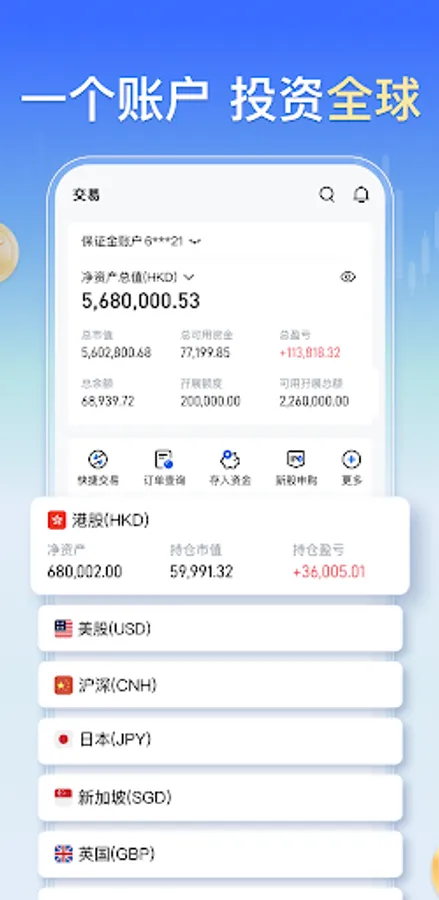 - Global investment: one-stop account management, simultaneous transactions in the same account, cross-market transactions around the world, providing real-time transactions including Hong Kong stocks, Shanghai and Shenzhen stocks, U.S. stocks, British stocks, Japanese stocks, Canadian stocks, Australian stocks and Singapore stocks single function.