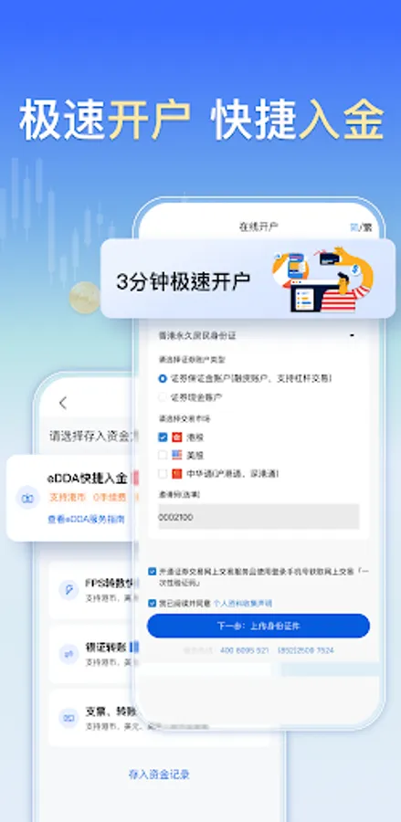- Quick deposit: support eDDA quick deposit, FPS fast transfer, bank-securities transfer, check, wire transfer.