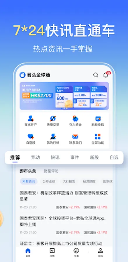 Junhong Global Link is a global investment platform created by Guotai Junan International for investors, providing users with "one-stop" financial services such as online account opening and Hong Kong and US stock trading, as well as rich information content and market display. Help you enjoy all-round investment anytime and anywhere, and keep abreast of the pulse of the market.