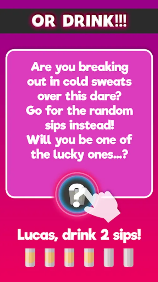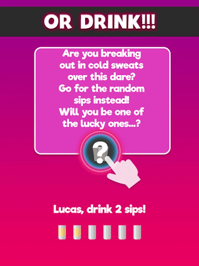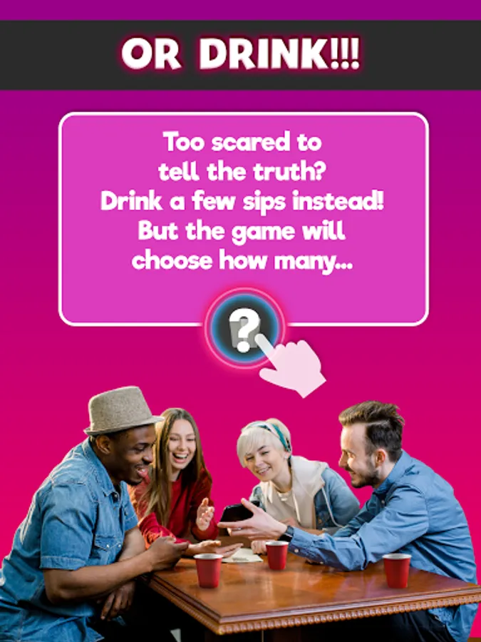 Our app isn't just classic Spin the Bottle, it actually mixes Truth or Dare and a drinking game! Of course, if you don't feel comfortable performing a dare or revealing a truth, you have another option, which is to push the mystery button that will tell you to drink a random number of sips. Don't take this too lightly!
