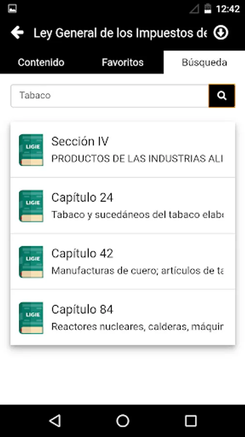 Search function. It also has search function, with which you can search for any text within all laws or those selections. It also has a search history feature, with which you will have no retyping the search term.