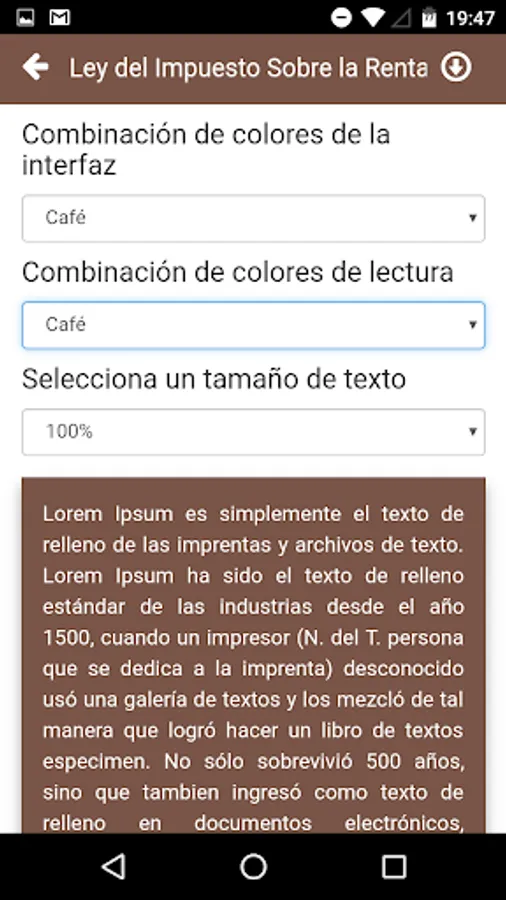 Themes Change the subject of display of the articles, we have 5 themes: Normal, Gray, High Contrast, Night and Old. In addition, you can also change the default zoom level of the text, so that reading it is easier.