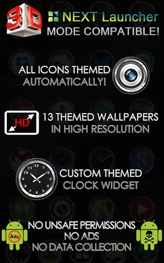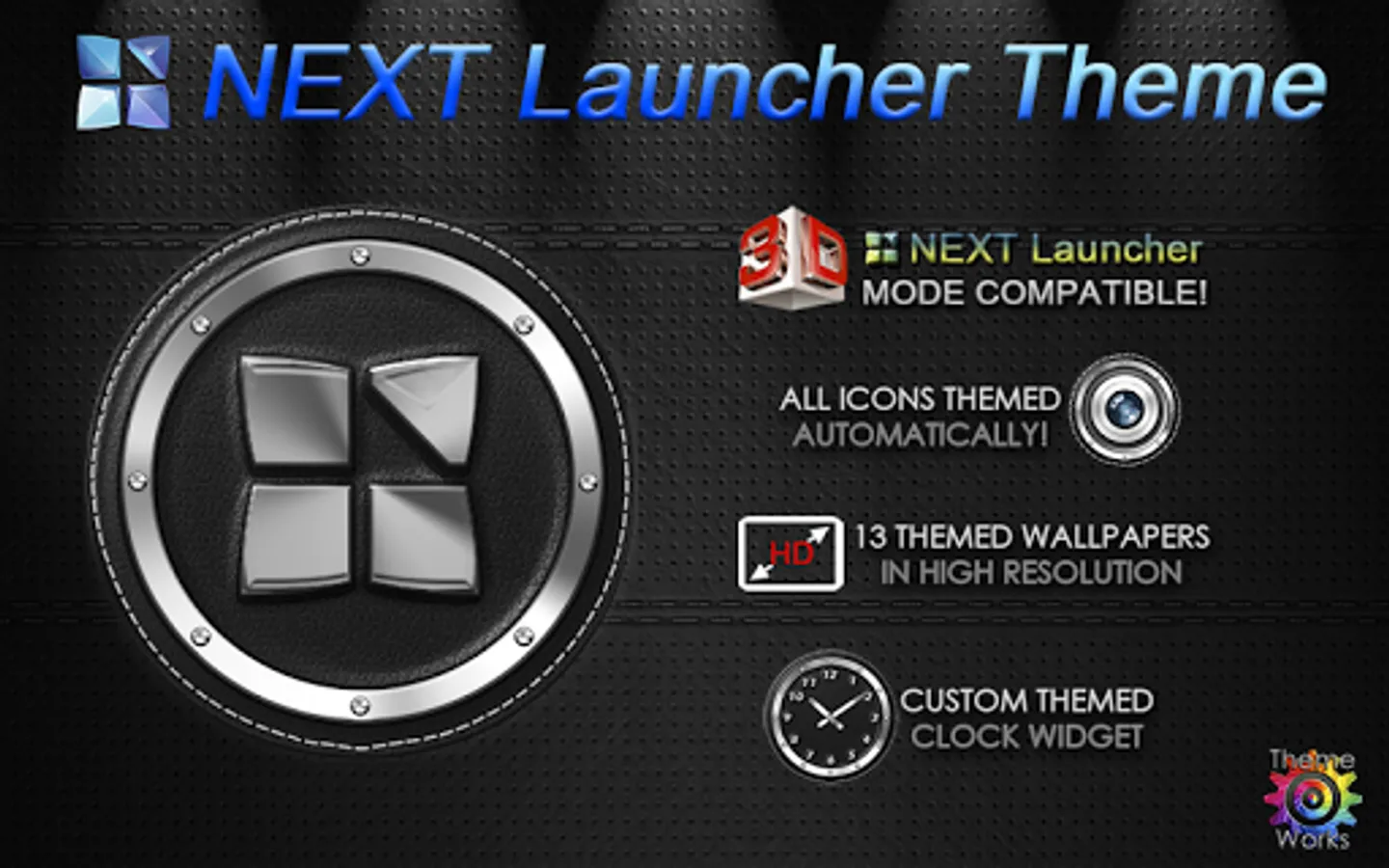 Next Launcher 3D theme. Extremely detailed and high quality sporty and modern Next Launcher theme with high definition graphics auto-themed icons, 13 custom themed HD wallpapers, and a metal clock widget, to give very detailed and defined graphics even in devices with the highest resolution screens. Everything is themed to the last detail, using metallic textures, lighting effects, reflections and gradients to give a great contrast and quality look.