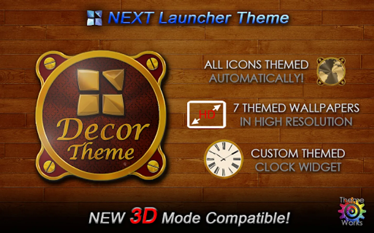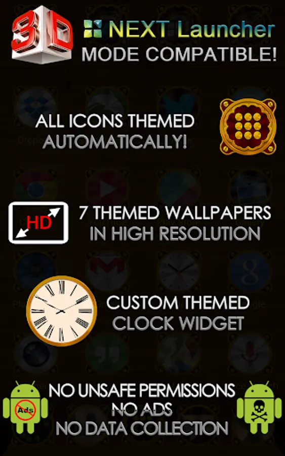 Next Launcher 3D theme. Extremely detailed and high quality elegant Next Launcher theme with high definition graphics auto-themed icons, 7 custom themed HD wallpapers, and a metal clock widget, to give very detailed and defined graphics even in devices with the highest resolution screens. Everything is themed to the last detail, using metallic textures, lighting effects, reflections and gradients to give a great contrast and quality look.