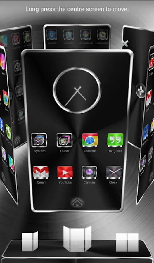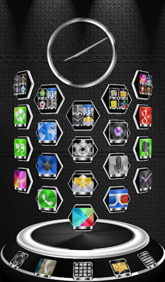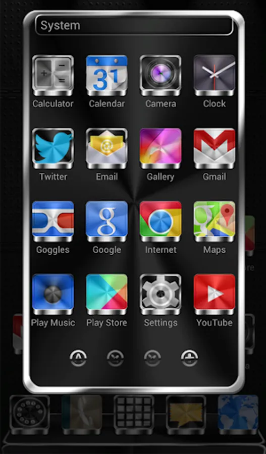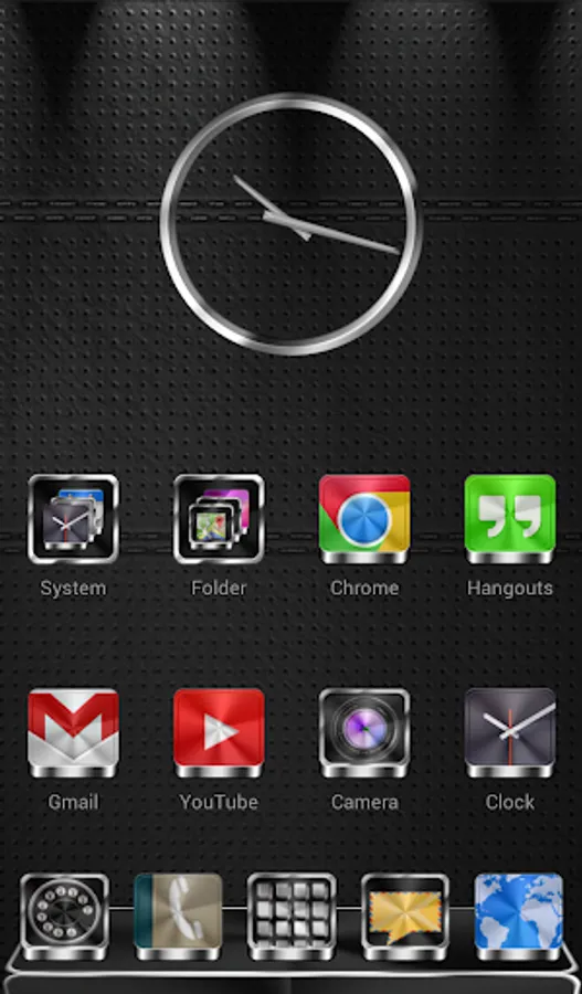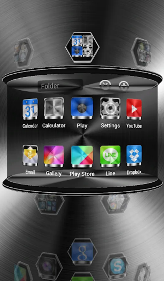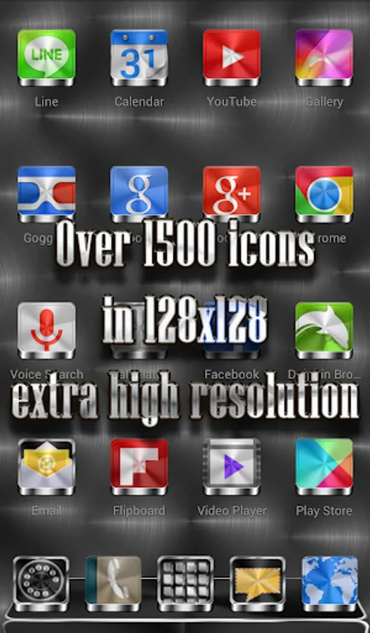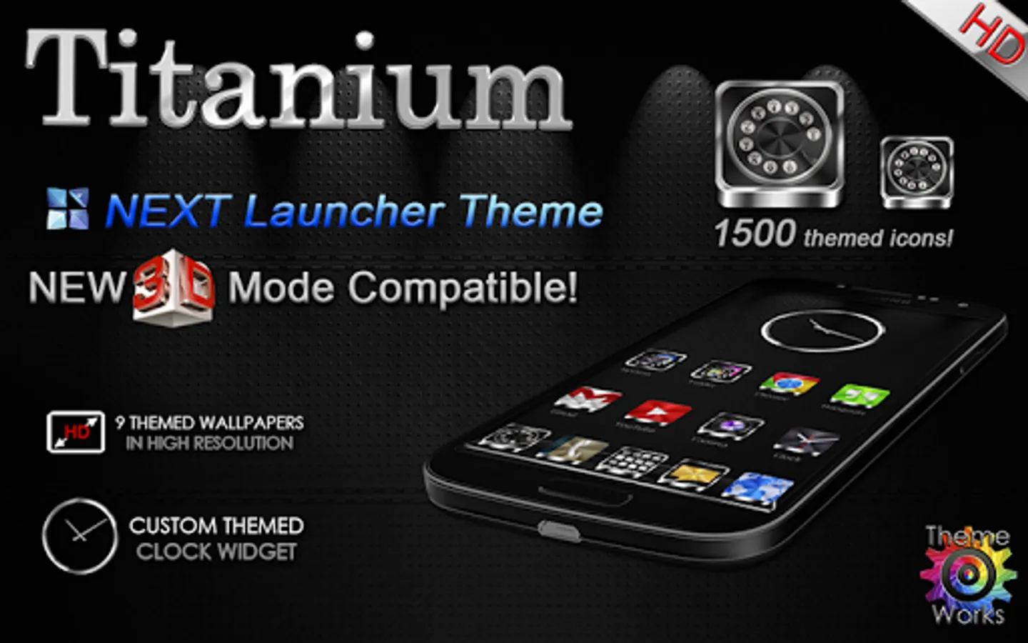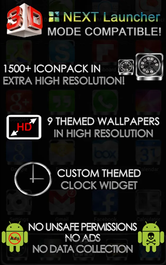 Next Launcher 3D theme. Extremely detailed and high quality elegant and modern Next Launcher theme with high definition graphics including a 1500 pack of HD icons, 9 custom themed HD wallpapers, and a metal clock widget, to give very detailed and defined graphics even in devices with the highest resolution screens. Everything is themed to the last detail, using metallic textures, lighting effects, reflections and gradients to give a great contrast and quality look.