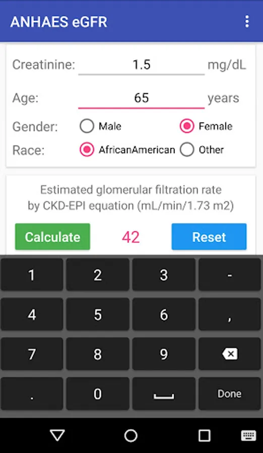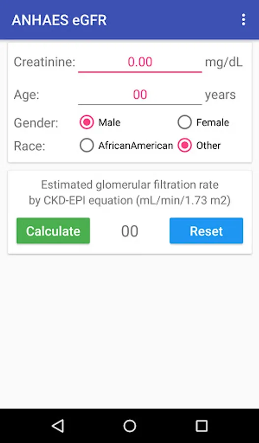 This simple application calculates the estimated glomerular filtration rate (eGFR) based on the CKD-EPI equation, to evaluate kidney function. It's extremely easy to use: fill in patient's creatinine (mg/dL), age, gender and race and the eGFR is displayed in mL/min/1.73 m2 quickly on the same screen.