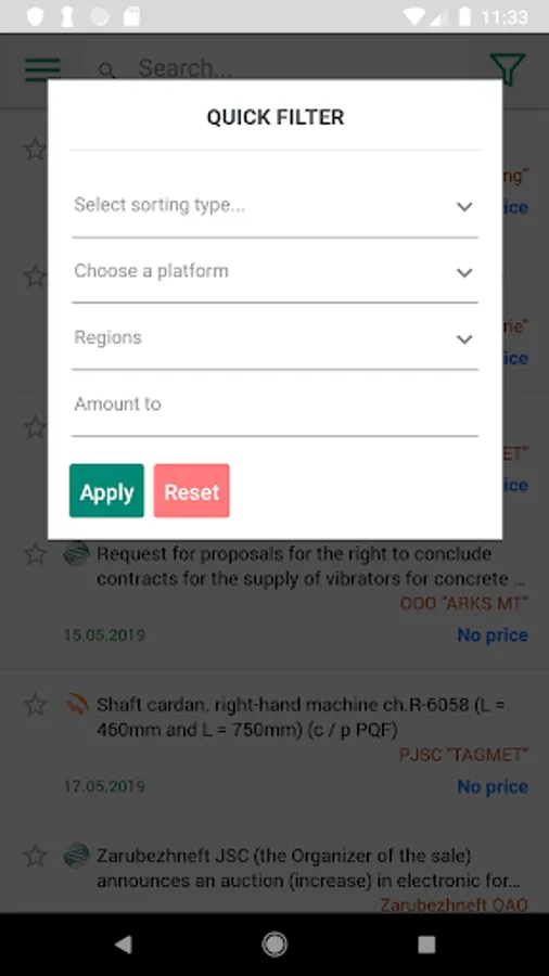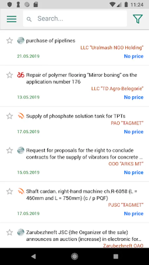 The application is designed to quickly and easily search for procurement procedures on electronic trading platforms (hereinafter - ETP) of the constituent entities of the Russian Federation. The search is carried out according to procurement procedures at the following ETP: UEI (subjects 223-FZ, 44-FZ), Pipe Metallurgical Company (PJSC “TMK”), ETP “GPB”, Agro-Belogorie and so on. The application also searches for sales of finished products from PJSC “TMK”.