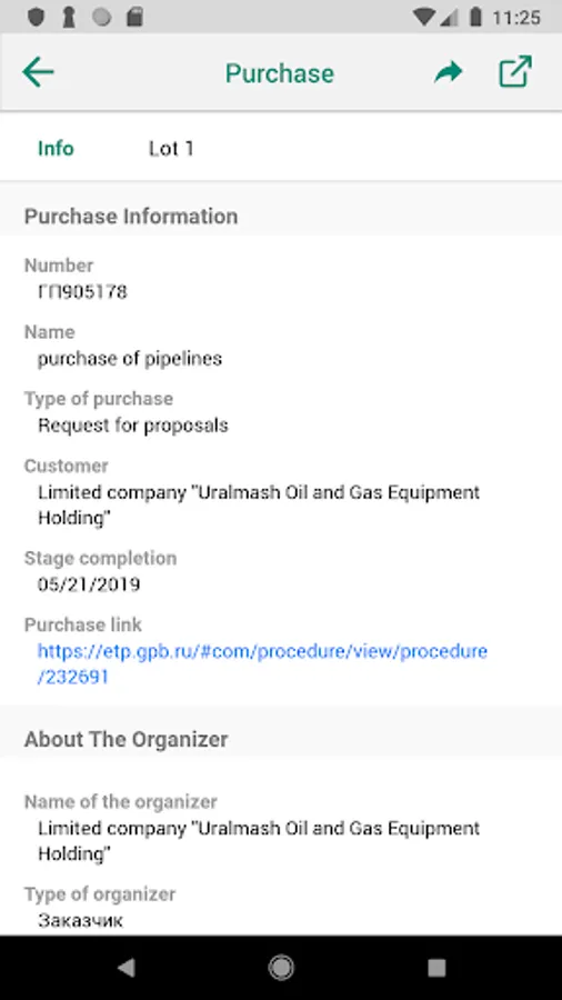 The application provides all available public information on procedures, including a full description of general information about the procedure, a detailed description of the items of purchase (lots, positions), as well as a direct link to the procedure of the corresponding ETP.