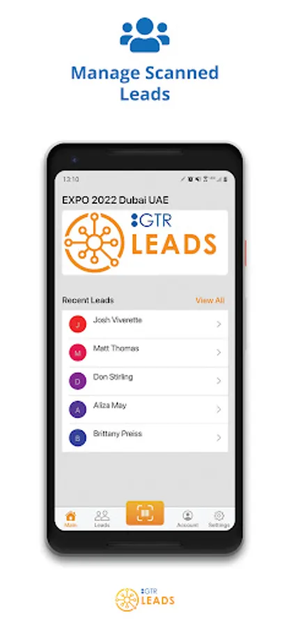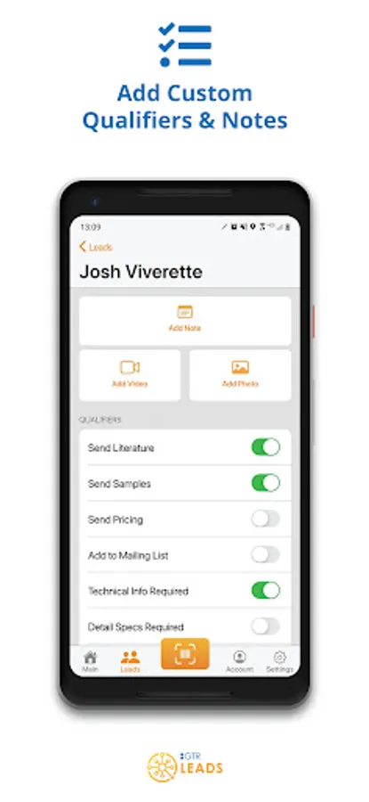 After downloading GTR Leads™ and activating your account, use your device to scan tradeshow badges and quickly follow up with qualified leads from your booth. Add custom notes, voice or video recordings, and sales qualifiers prior to uploading to your preferred CRM. Download leads directly through the app or online. No hardware is necessary.