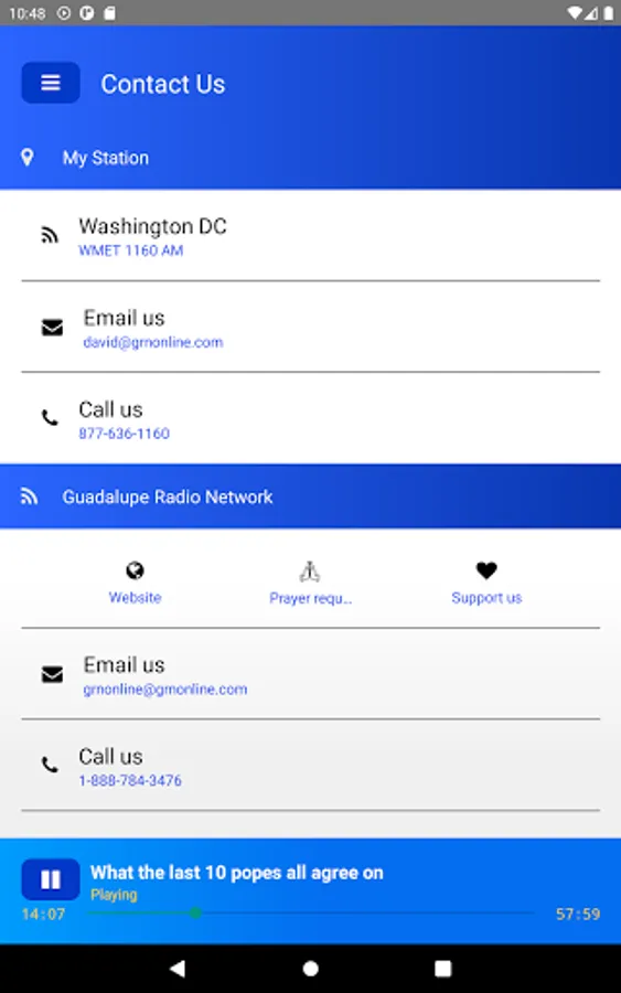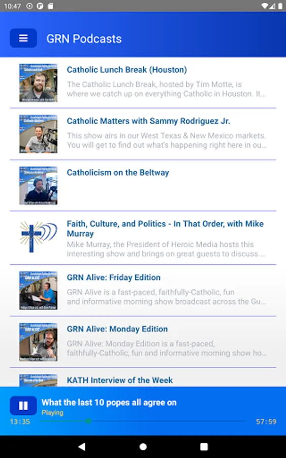 This is the official app for the Guadalupe Radio Network. Listen to your local GRN station to hear popular shows from EWTN, Ave Maria Radio, our own local personalities, and more!