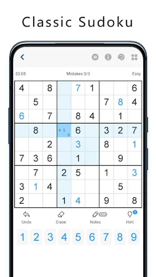 The rules of the Classic Sudoku puzzle game are very simple. The goal is to put 1 to 9 numbers into each grid cell so that each number can only appear once in each row, column, and block. Even a beginner can master the sudoku free puzzle game in a very short time.