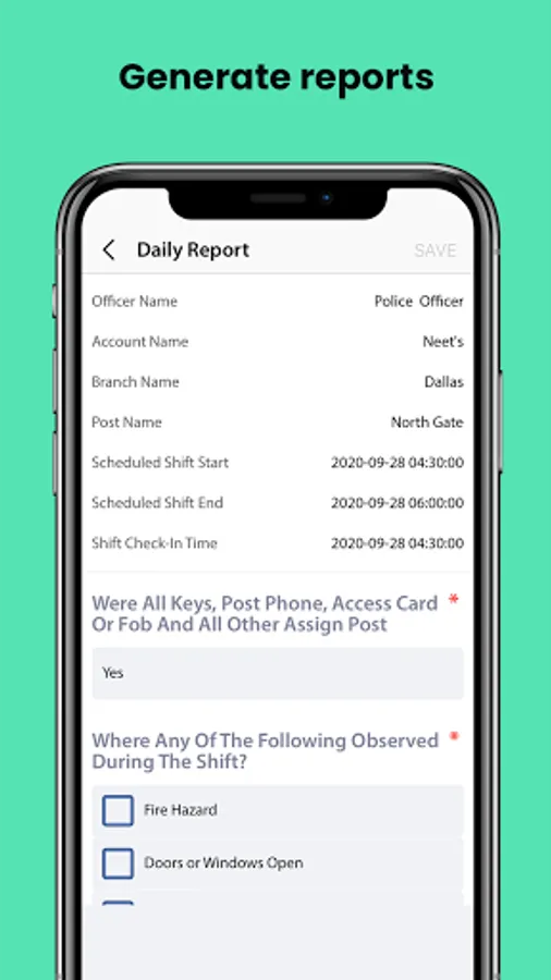 After the security guard checks in and reads the post instructions, they fill out forms for their replacement if they replaced someone, and if any items were assigned to them for the shift. This report is automatically sent to StaffWizard's main program.