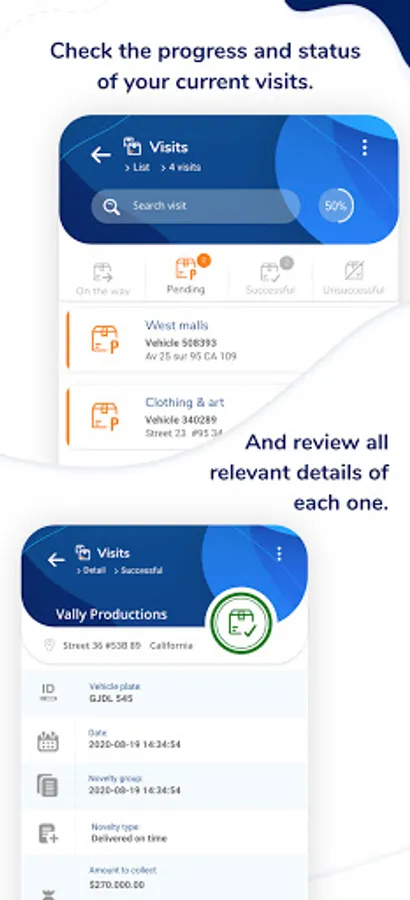 - Follow up your visits ordered by status: on the way, pending, successful, unsuccessful.