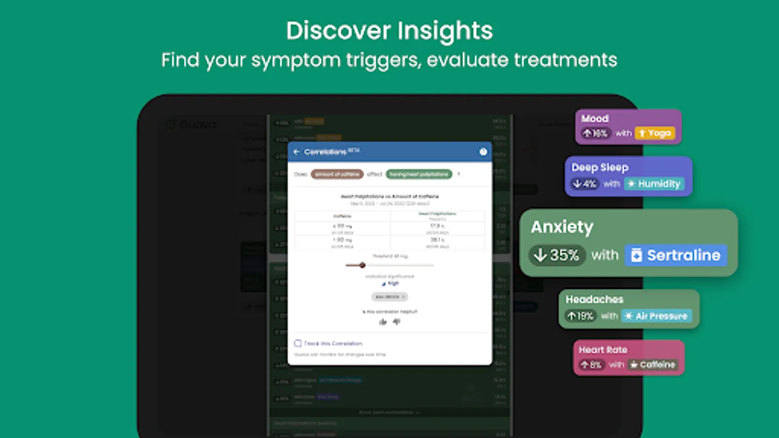 ✔️ GET PERSONALIZED INSIGHTS: Guava automatically finds correlations between your symptoms, meds, lifestyle, and more. Find out if your new medication affects your mood or if certain foods or weather events cause flare-ups. Gain a deeper understanding of your chronic illness and your health.