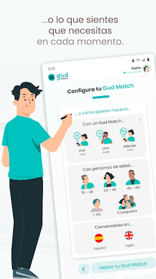 Select your channel preferences (chat, call, video call or surprise me), language and age range and Gud Match will match you with another guder to share 20 minutes of conversation.