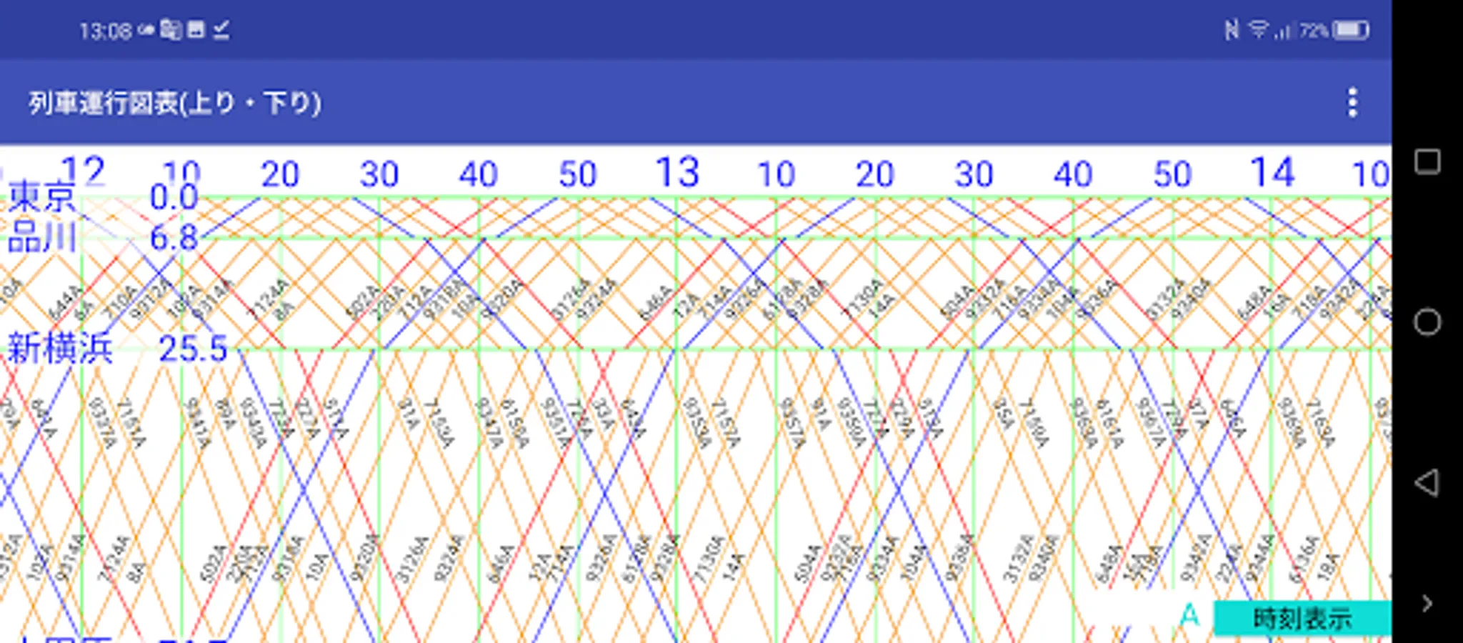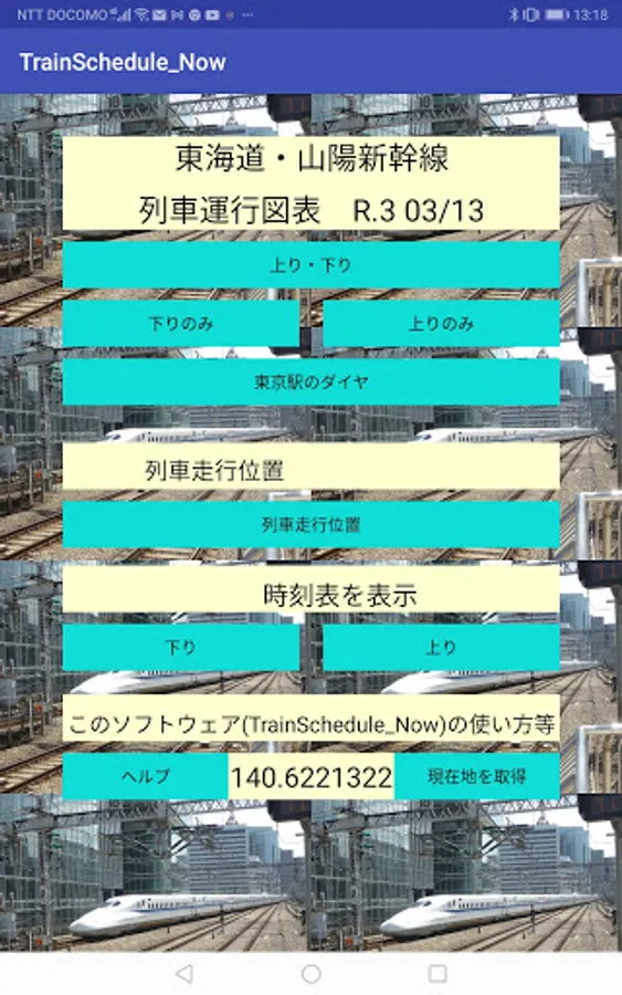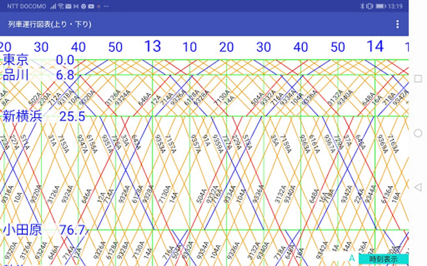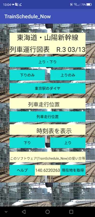 The Shinkansen is the Japanese ultra-high speed(maximum speed is 300km/h) cutting edge train network and the TrainSchedule_Now is a software which displays train diagrams and timetable of the Tokaido Sanyo Shikansen line on Android terminals. That line runs through Tokyo, Shin-Yokohama, Nagoya, Kyoto, Shin-Osaka, Okayama, Hiroshima and Hakata, and carries more than 200 million passengers per year and is operating almost 500 regular trains per day. Its data is basically based on the latest train schedule. From the first main menu screen, you can move to train diagrams or timetable by pushing each button. With the train diagrams screen, you can scroll and zoom it.