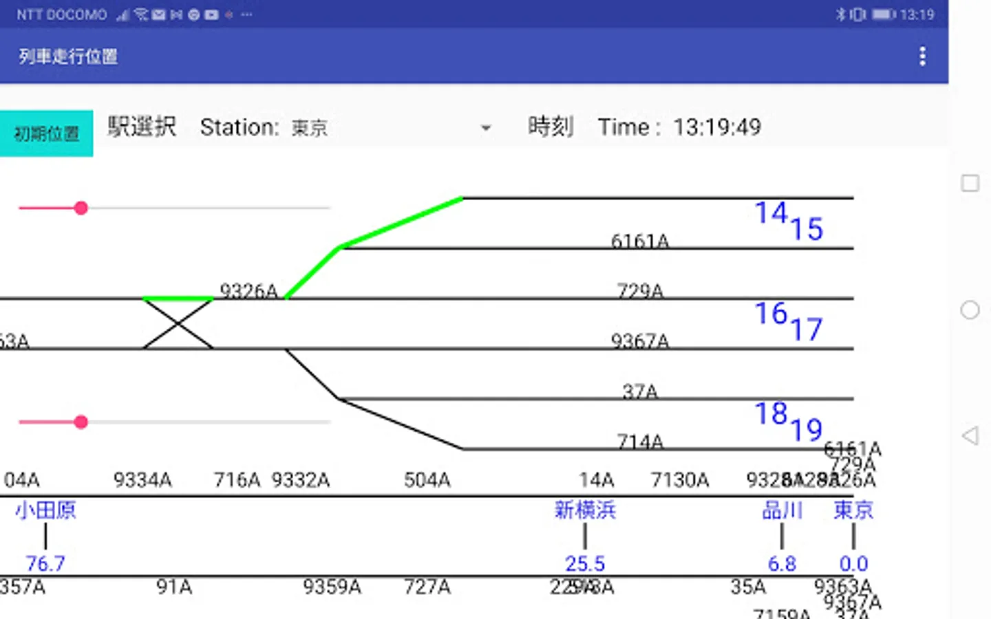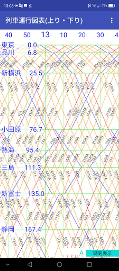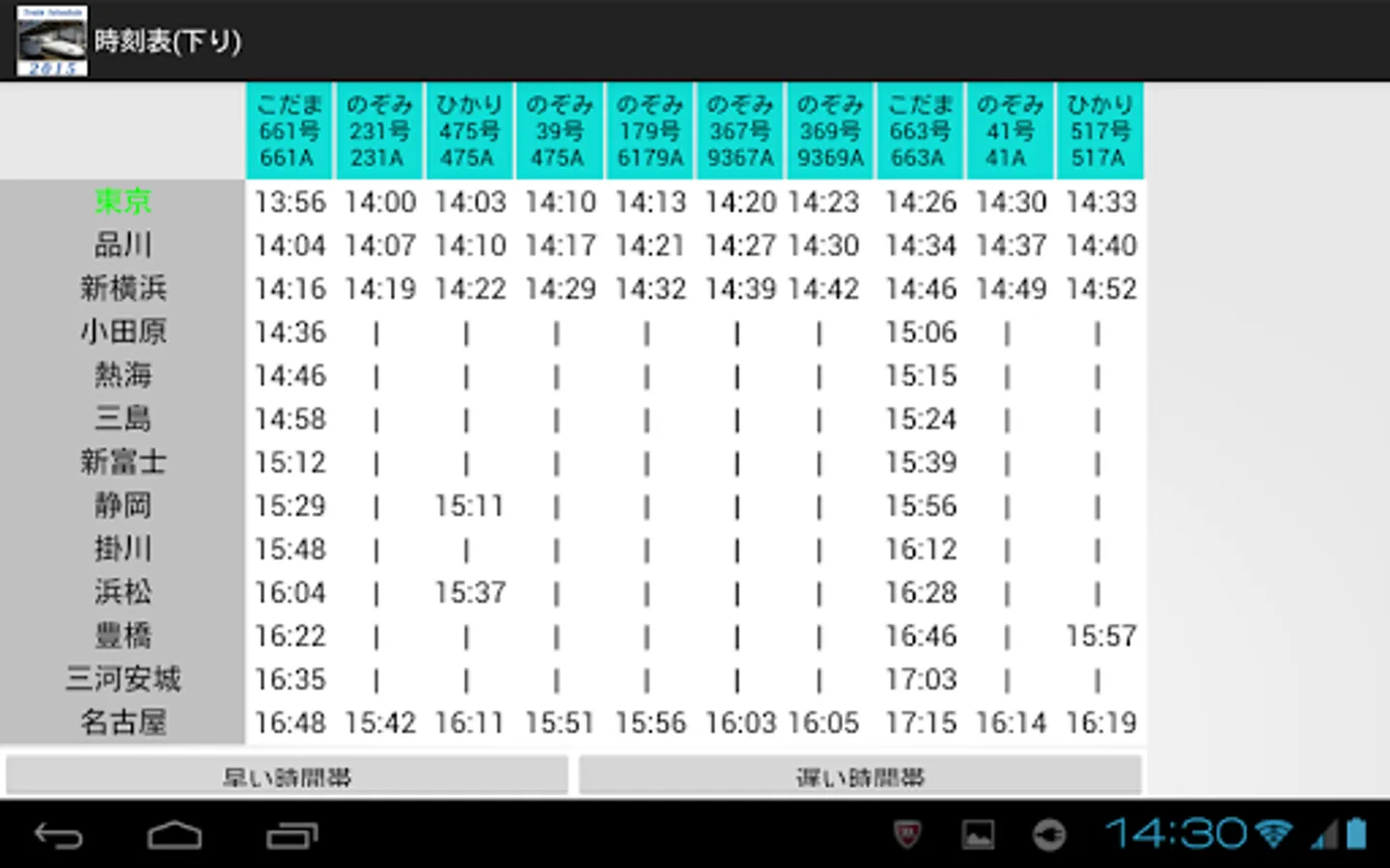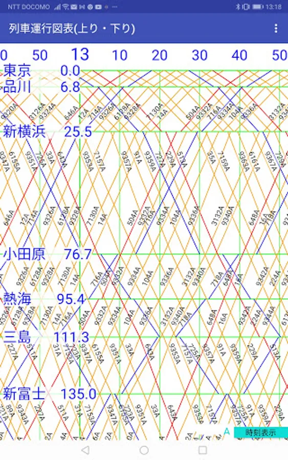 The Shinkansen is the Japanese ultra-high speed(maximum speed is 300km/h) cutting edge train network and the TrainSchedule_Now is a software which displays train diagrams and timetable of the Tokaido Sanyo Shikansen line on Android terminals. That line runs through Tokyo, Shin-Yokohama, Nagoya, Kyoto, Shin-Osaka, Okayama, Hiroshima and Hakata, and carries more than 200 million passengers per year and is operating almost 500 regular trains per day. Its data is basically based on the latest train schedule. From the first main menu screen, you can move to train diagrams or timetable by pushing each button. With the train diagrams screen, you can scroll and zoom it.