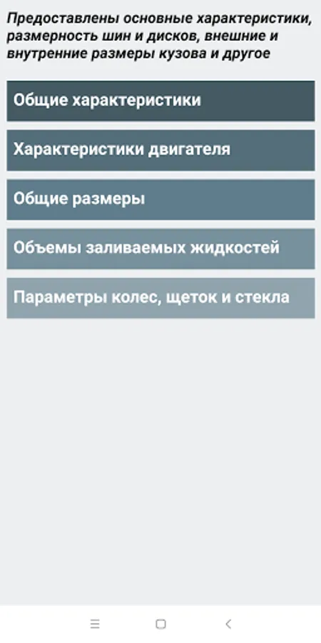 - section "technical characteristics" - provided the main characteristics with different types of engines, wheel dimensions and overall body dimensions