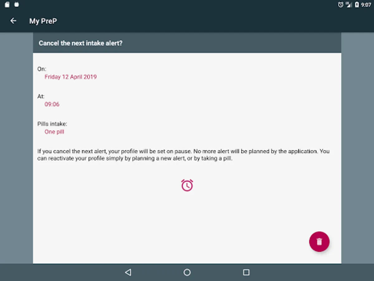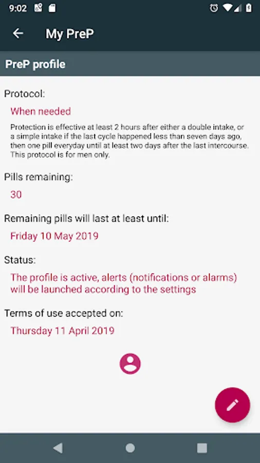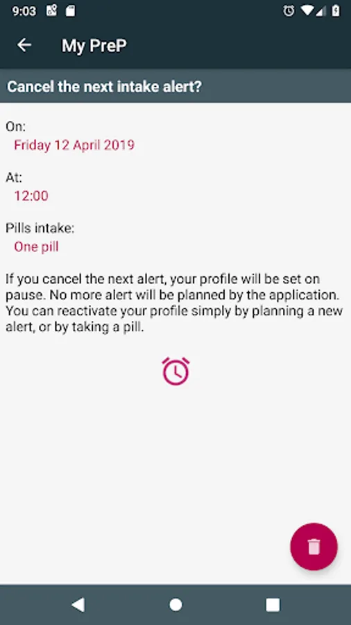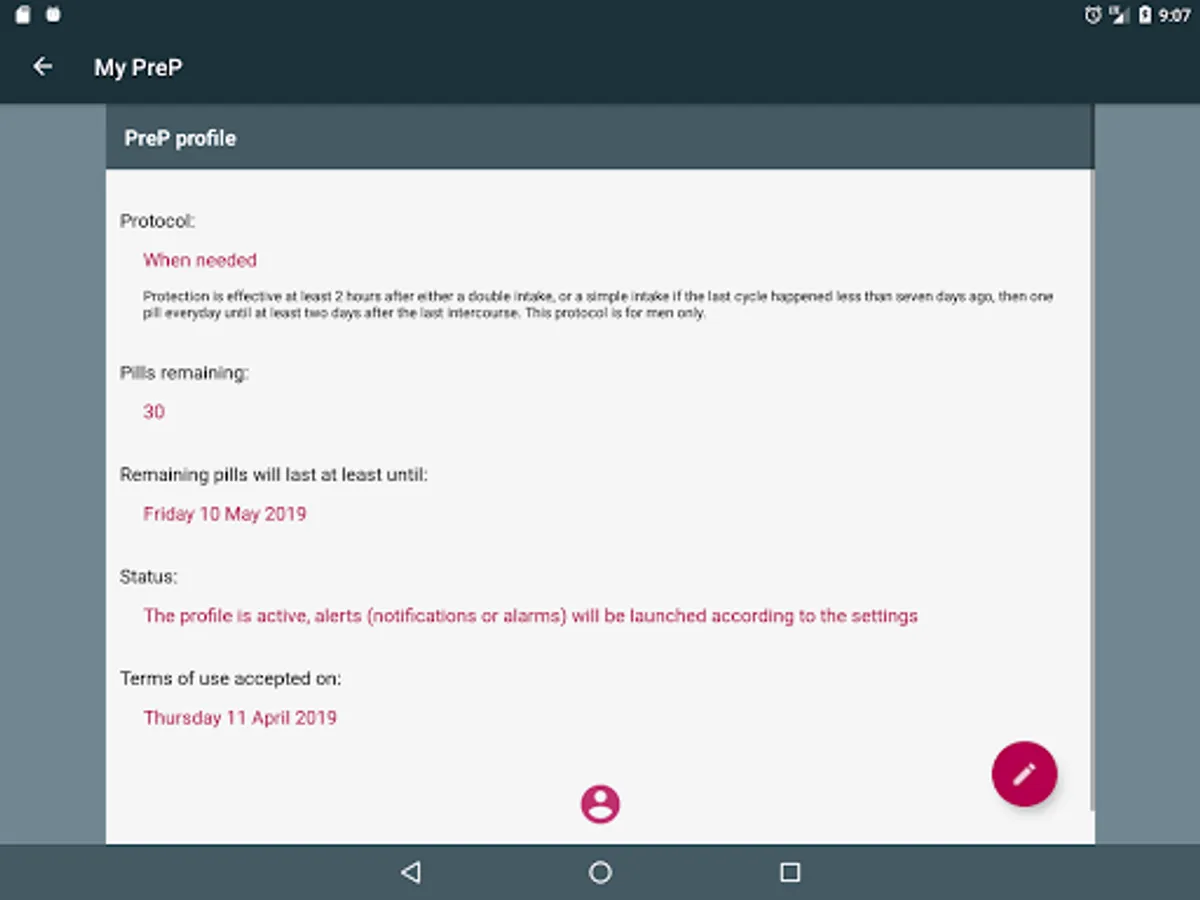 This application will help you following you preventive PrEP treatment (pre-exposure prophylaxis), by assisting you with your intakes and activating alarms and notifications when it is time to take your pill.