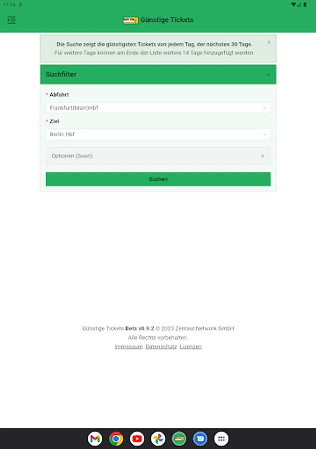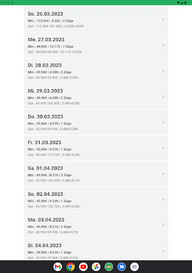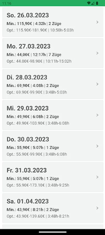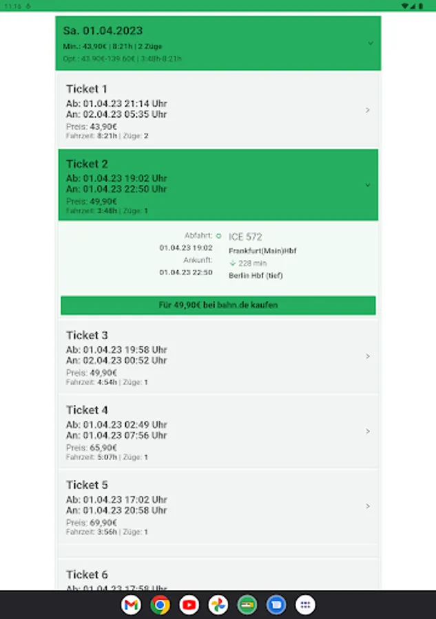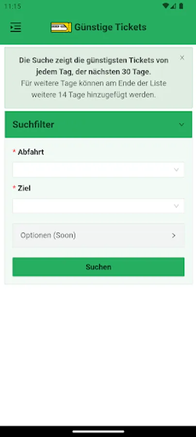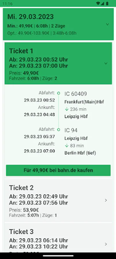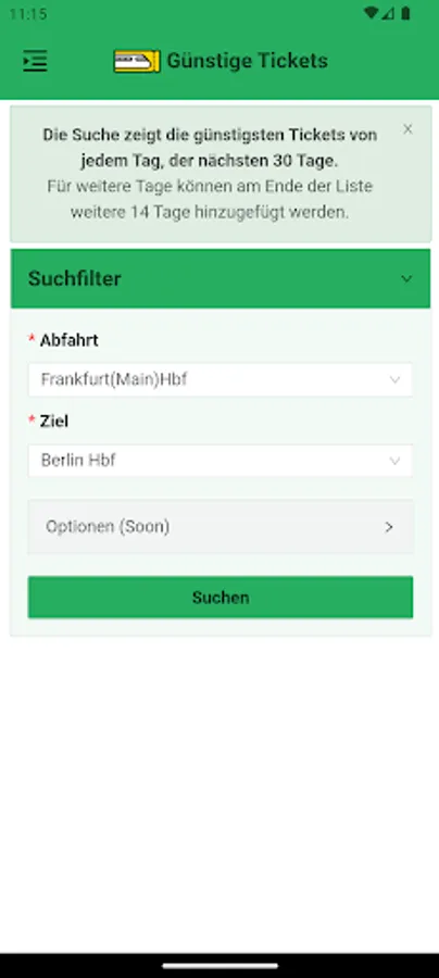 Find the cheapest train ticket for your next trip in Germany, Austria and Switzerland - with just a few clicks! Our app searches offers from various providers and shows you all available tickets for the next 30 days, sorted by price. So you can quickly and easily choose the best deal and save money.