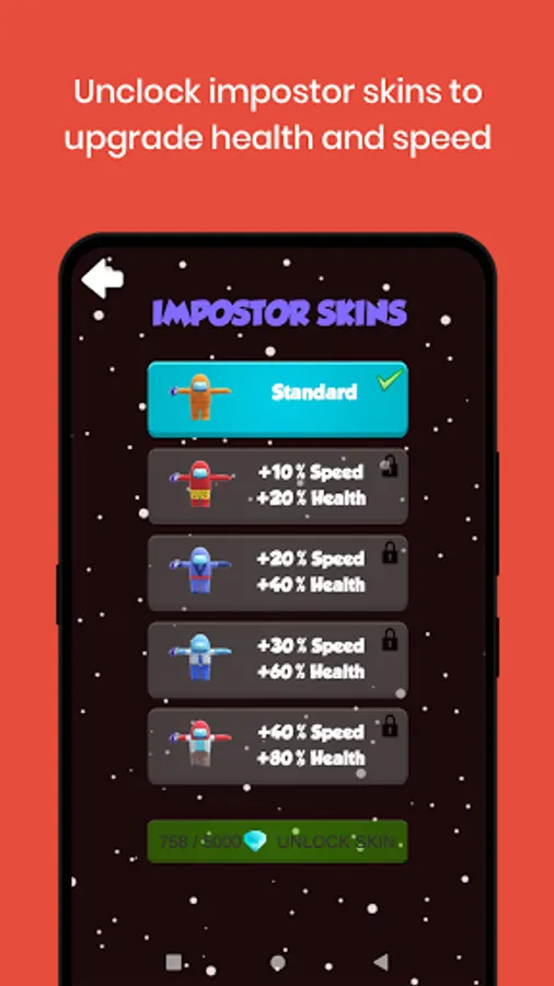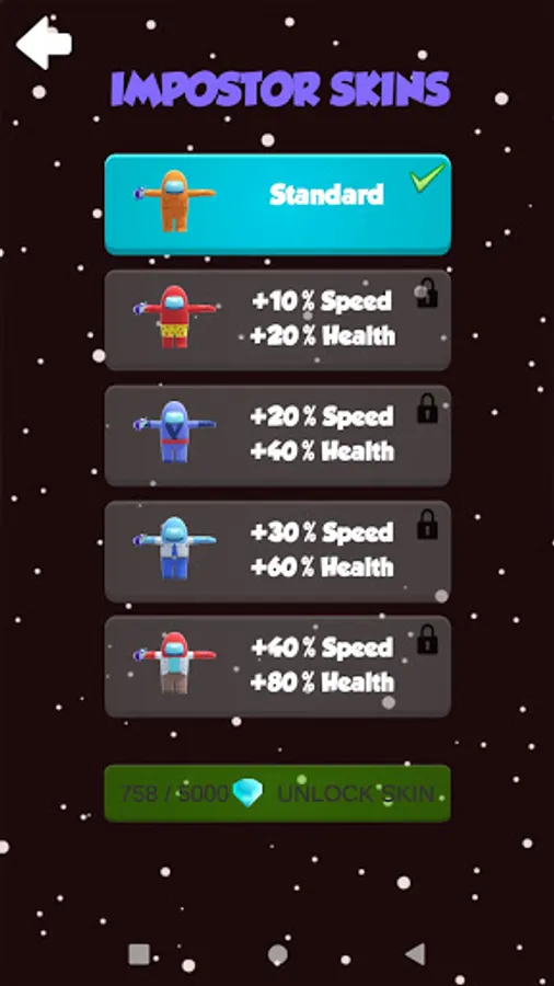 Each eliminated imposter gives precious stones. Use the gems to unlock faster skin imposter assassin killer.