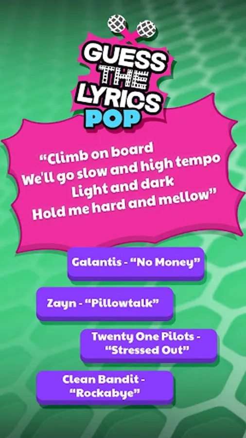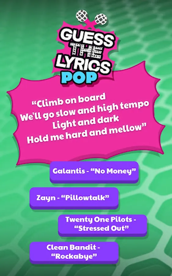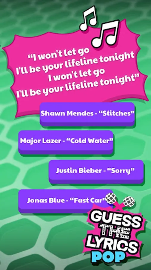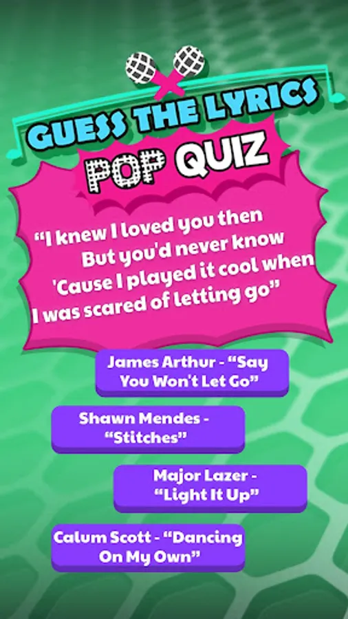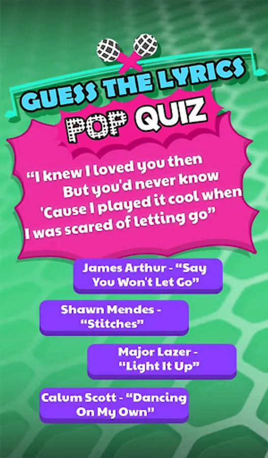 Boost your music knowledge, learn new pop songs and lyrics in an awesome fun music game! Download Guess The Lyrics Pop Quiz for Android™ and test your knowledge of easy and difficult pop lyrics in one of the best pop lyrics trivia apps ever!