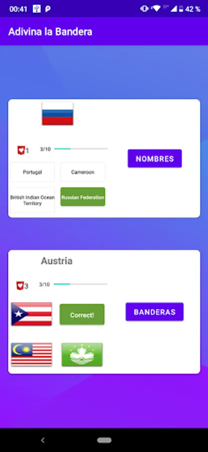 "Flags of the world" is a game to learn all the flags of the countries of the world, if you like this kind of games we invite you to try this one and learn the flag of all the countries of the world with this trivia type game.