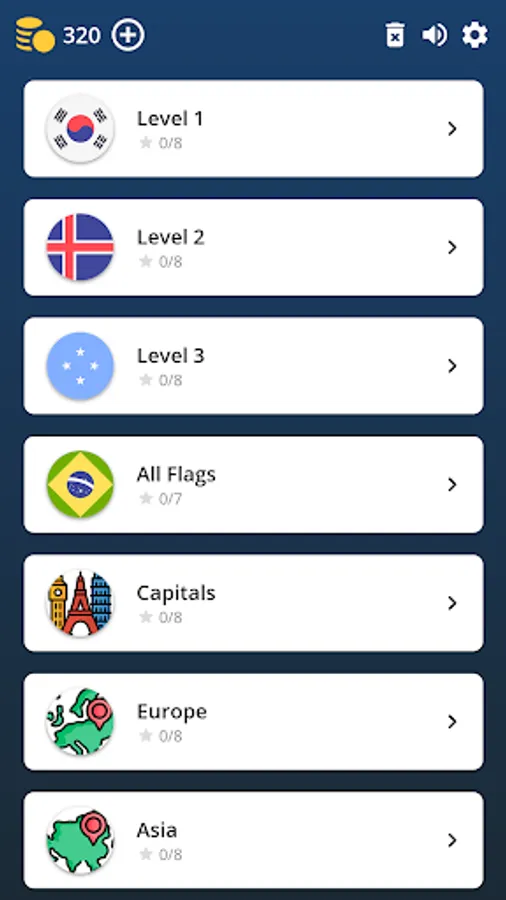 This flags game contains different levels and different trivia quizzes: