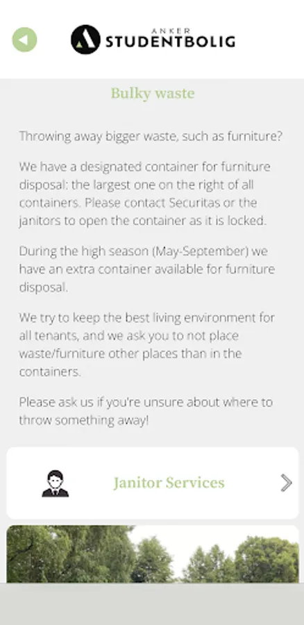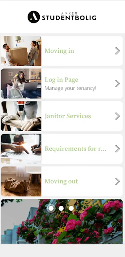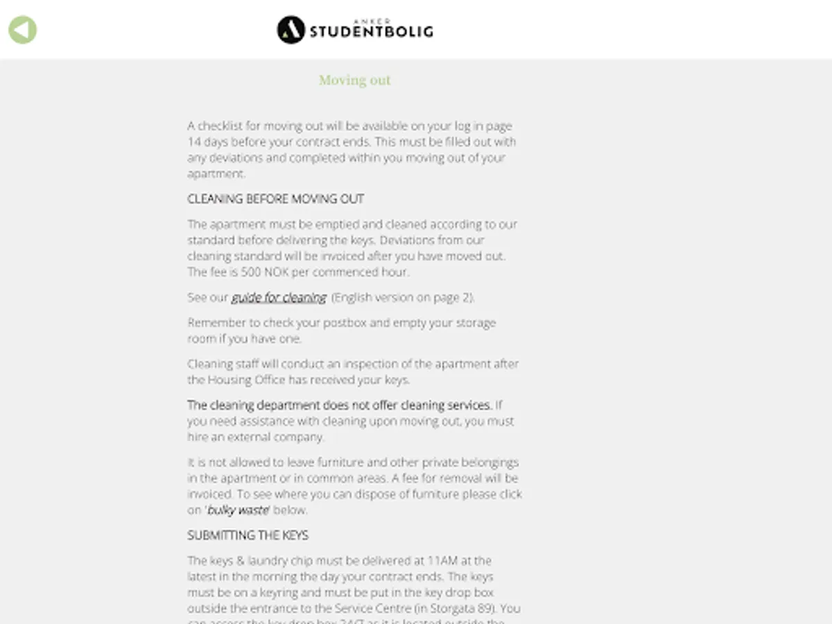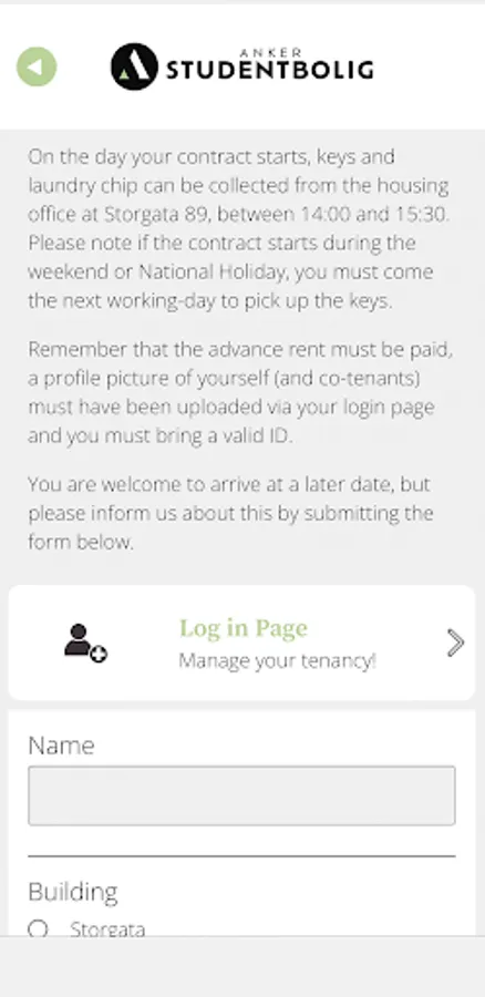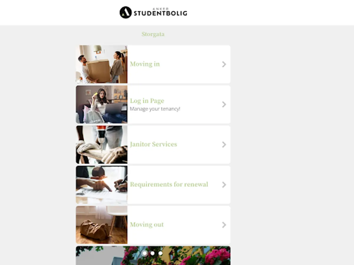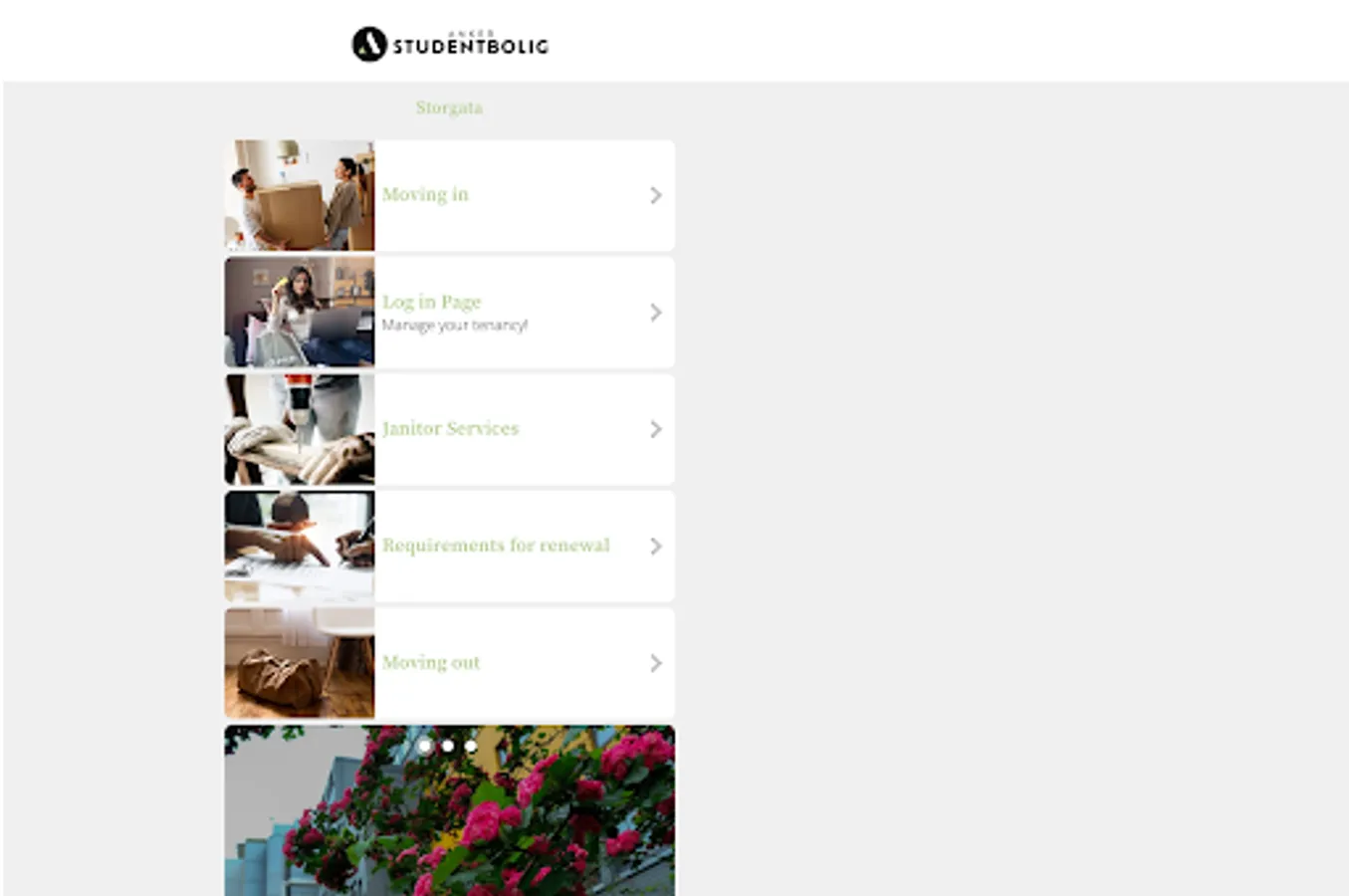 Anker Studentbolig can finally offer our tenants an app that provides you with all information regarding your tenancy. You'll find usefull information such as: - arrival information - house rules - how waste management works - how to pay rent - notices of planned maintance - digital phone keys (for certain addresses) and much more. It's like having the housing office in your pocket! We highly recommend that you enable push notifications to be updated on important announcements at all times.