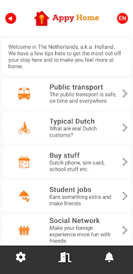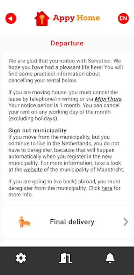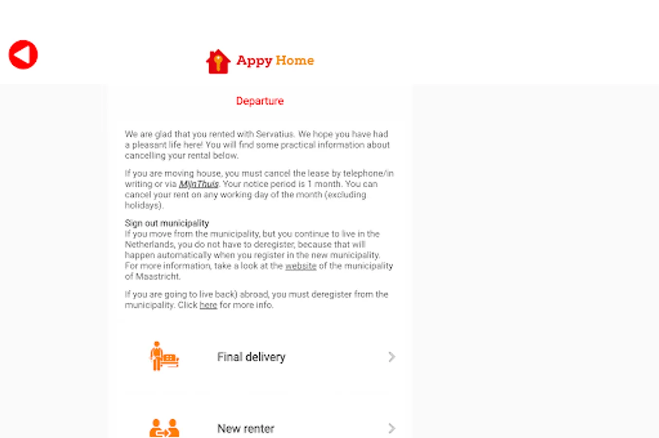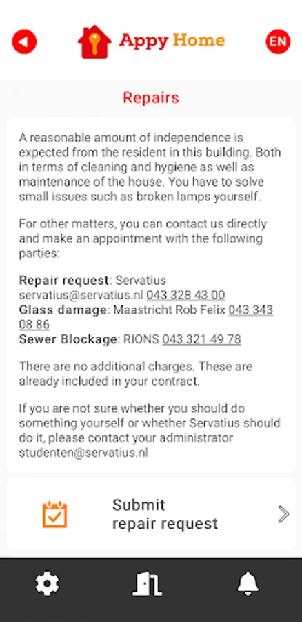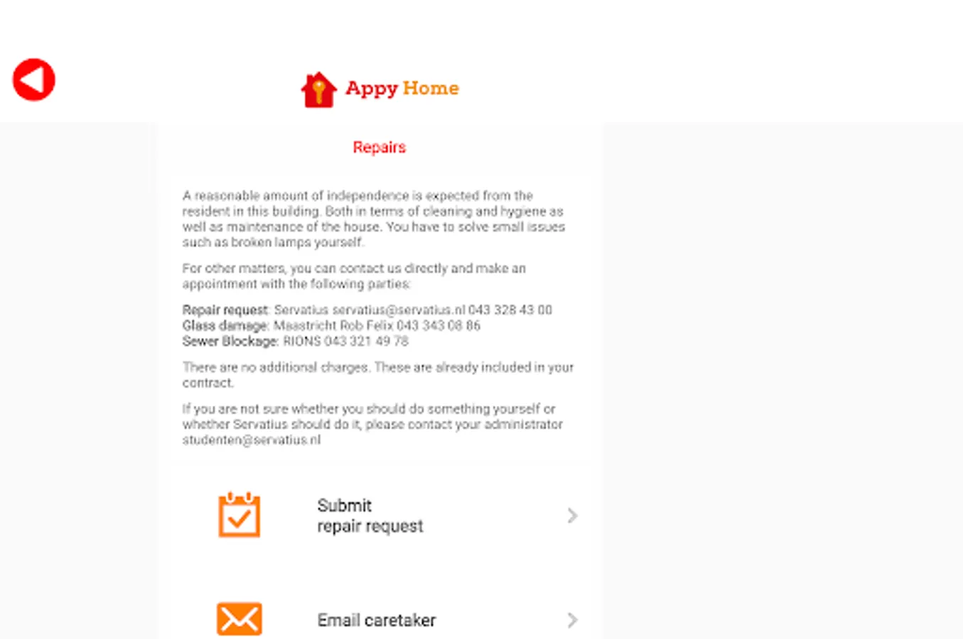 In the Appy Home app you will find all practical information about the facilities in and around the student building in which you live. If you want to quickly find the answer to your question, take a look at Appy Home! Via push messages, Servatius keeps you informed of various activities, malfunctions, settlement of service costs and much more. Be sure to turn on the push notifications option to stay informed of the latest news!