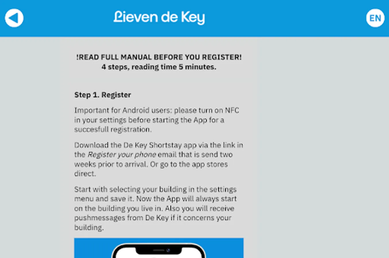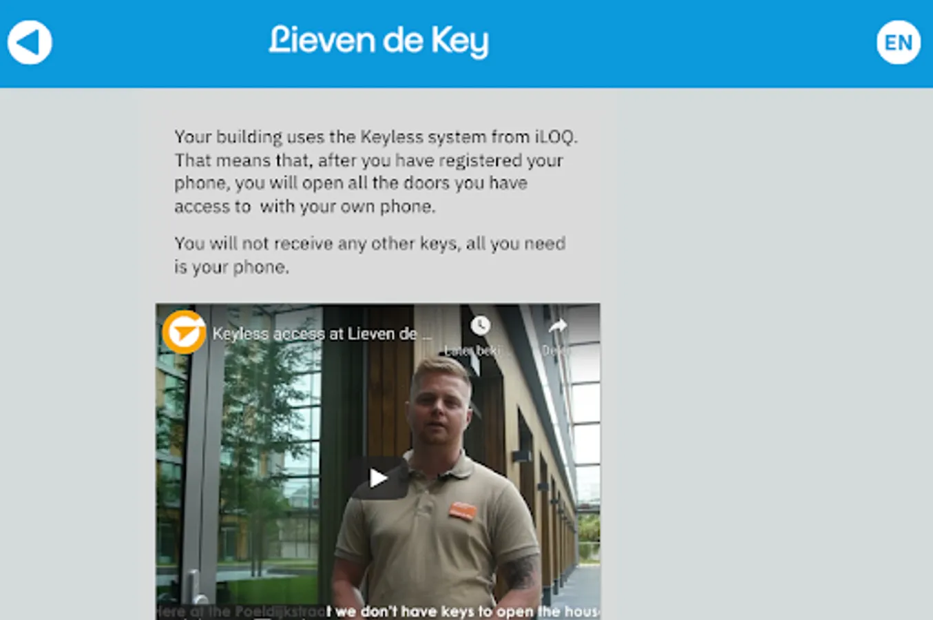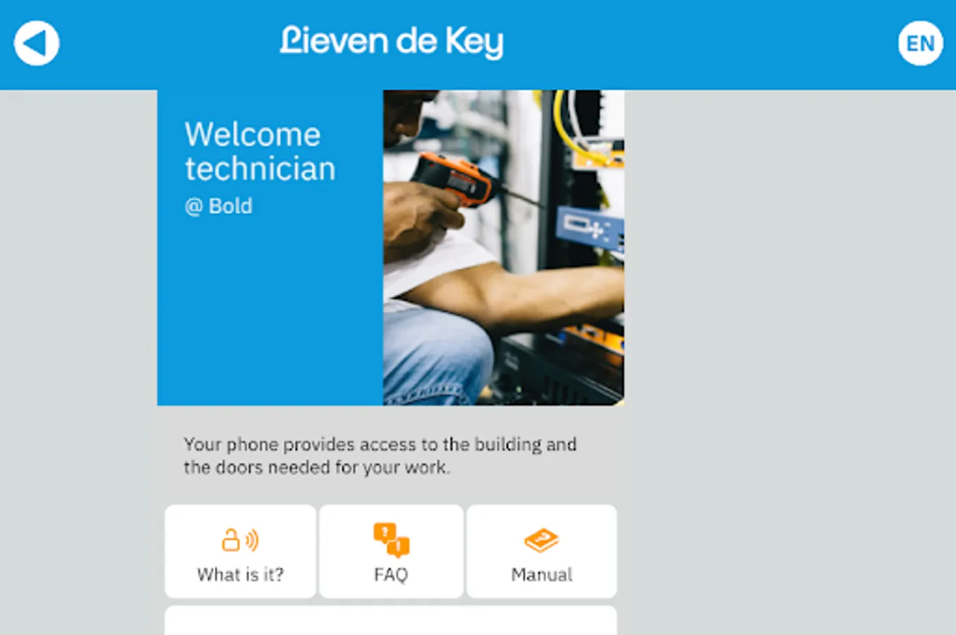This app provides access to all maintenance areas for the contract partners from Lieven de Key. After installation and registration, the phone will function as a digital key. Access is provided only for the contract period and necessary areas.