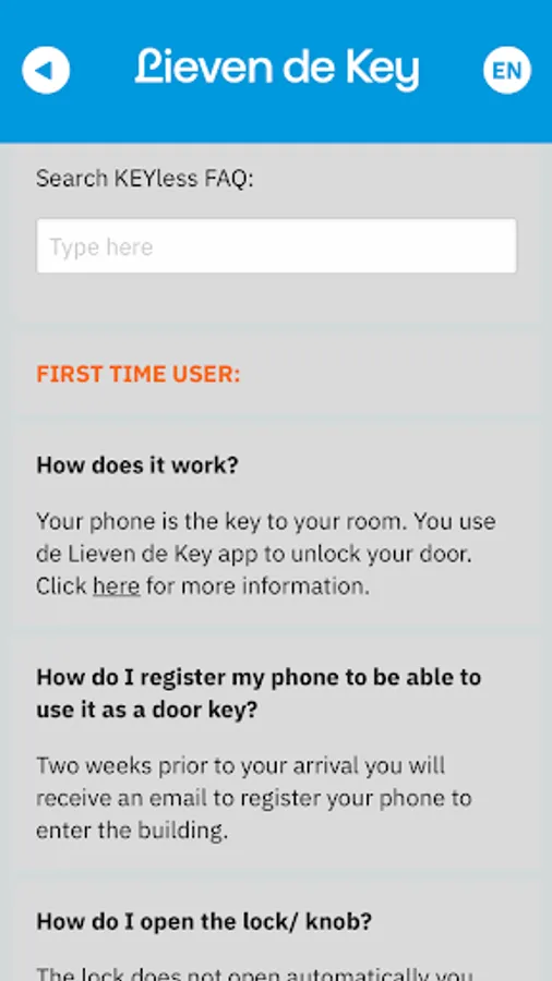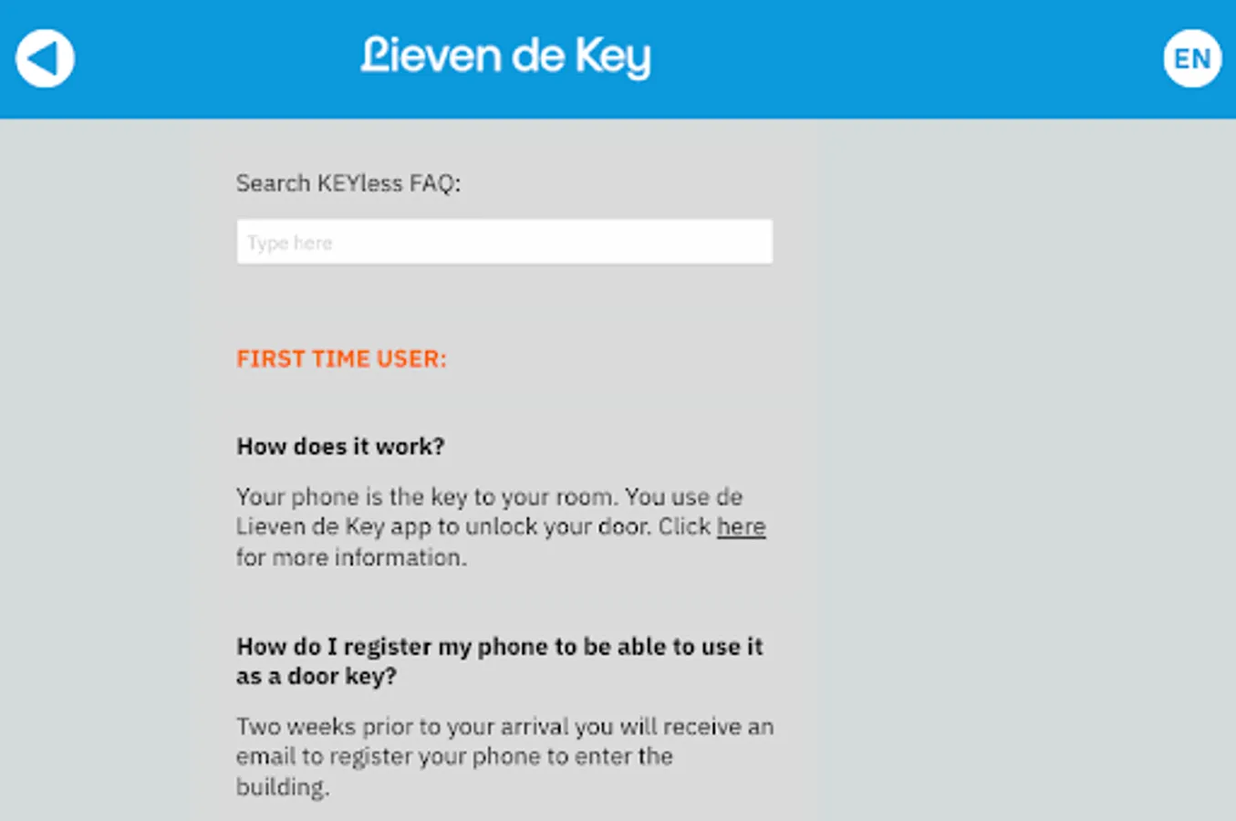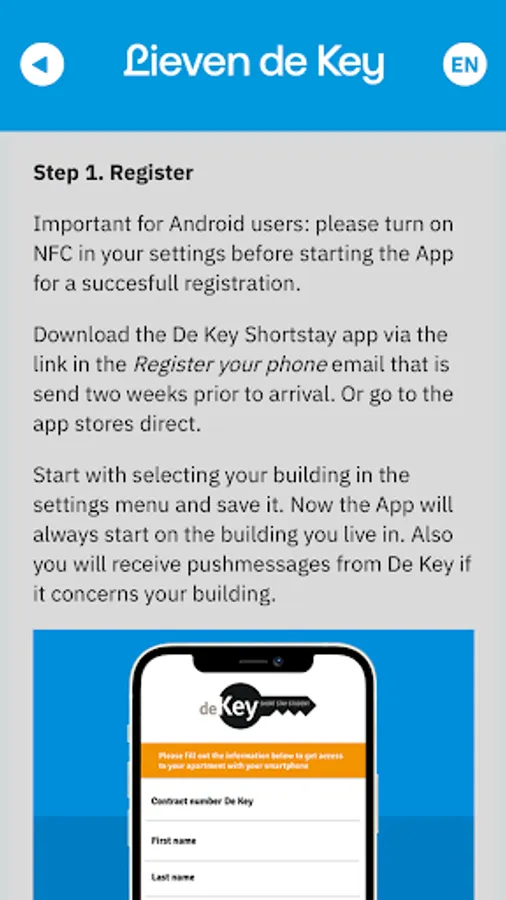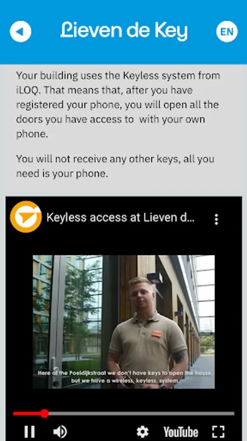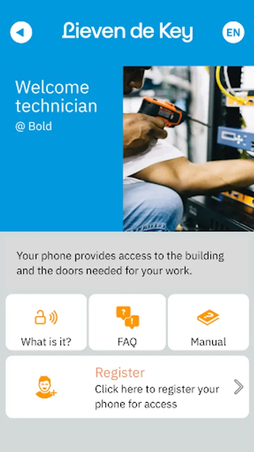 This app provides access to all maintenance areas for the contract partners from Lieven de Key. After installation and registration, the phone will function as a digital key. Access is provided only for the contract period and necessary areas.