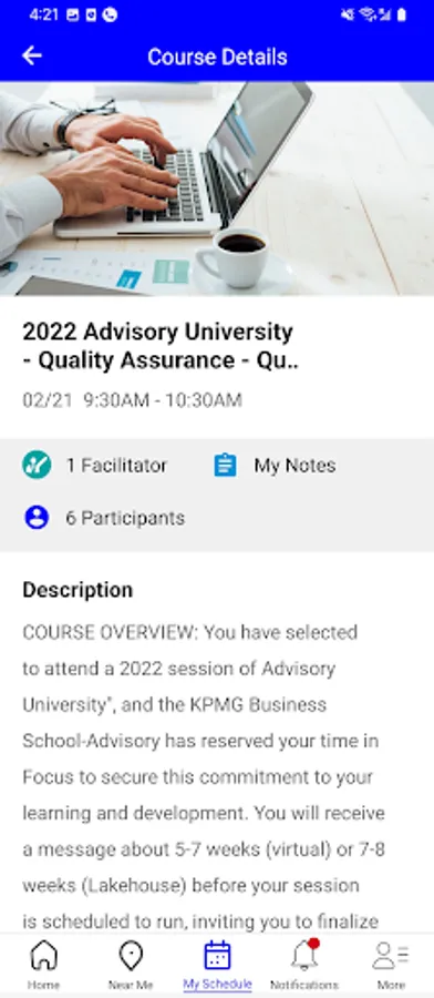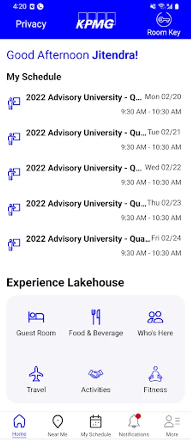 The KPMG Lakehouse mobile app is your primary tool to connect and navigate your stay at Lakehouse. Use the app as your digital key, view your personal schedule, check into classes for CPE credit, connect and collaborate with other KPMG colleagues in learning and social settings, view available well-being activities and explore the many dining options at The Exchange and to place your mobile orders at Common Ground. The mobile app is your tool to be all-in at Lakehouse.