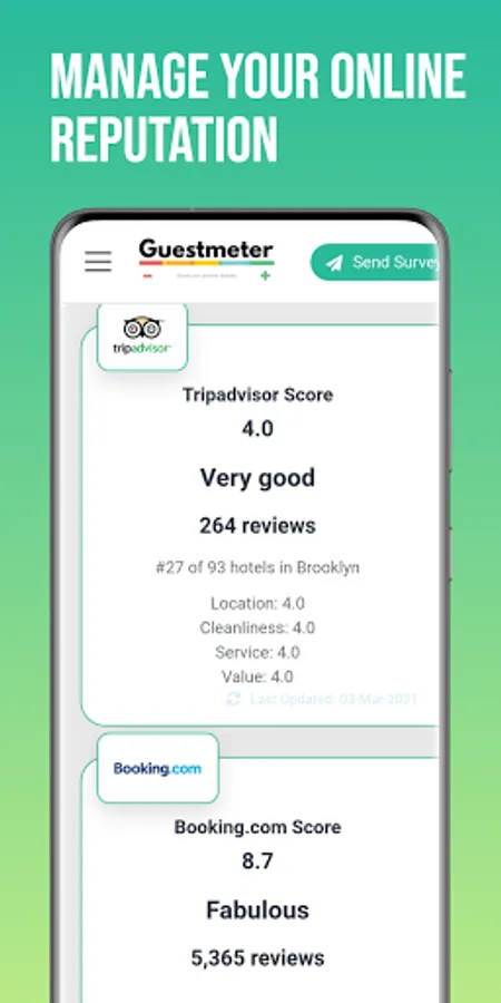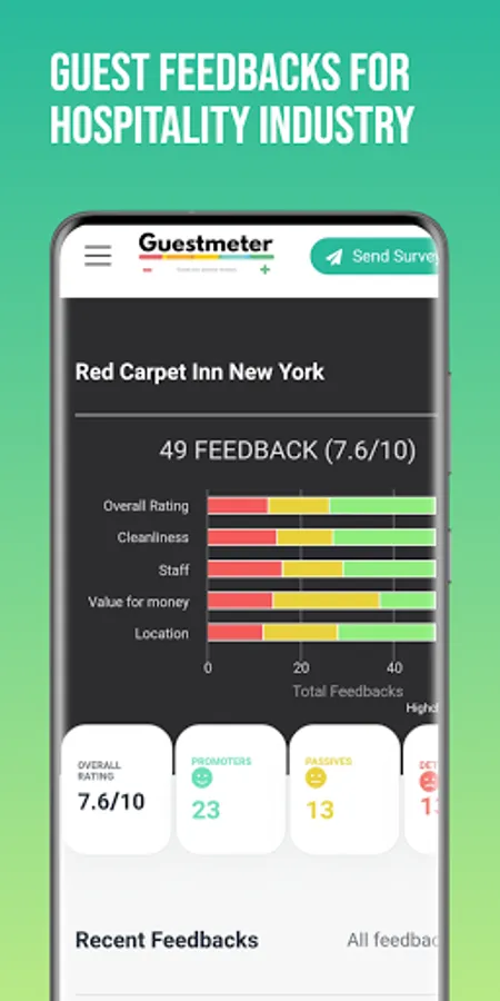 Guestmeter is the all-in-one guest feedback and reputation management software for hospitality industry. Our online reputation management tool and the guest satisfaction survey solution, you can experience the power of Guestmeter on your android smartphone or tablet. It allows you to engage with guests and manage online reviews in Tripadvisor, Booking, Hostelworld, Zomato, Yelp, CruiseCritic, Google and more. Our mobile app makes it easy to manage guest feedbacks wherever you are and receive alerts in real-time so you can act quickly to ensure guests leave your business happy.