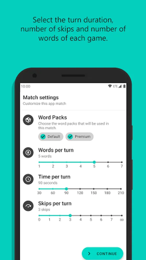 • Customizable: Define the time, number of players, number of skips and number of words of each game.
