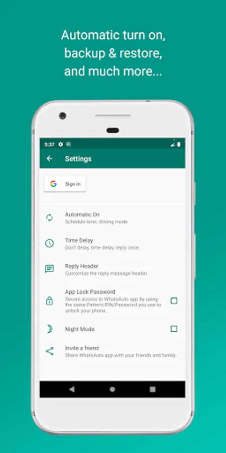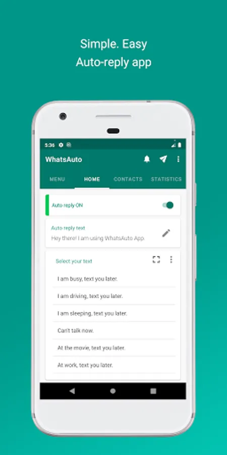 Customise the reply time. You can set WhatsAuto to send auto reply continuously or to send after some time delay or to send only once.