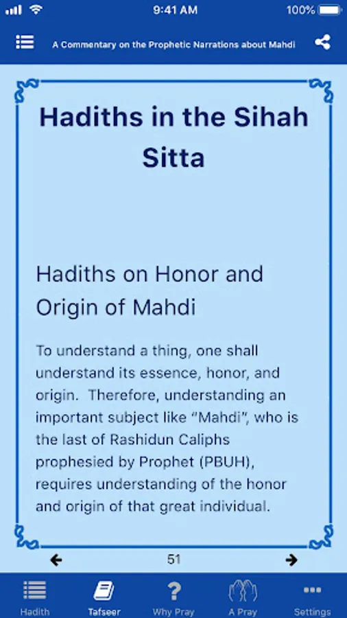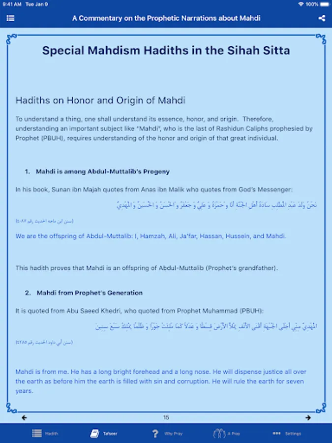 The Sihah Sitta includes two spectra of hadiths on Mahdism: In the first series of hadiths the notion of Mahdism is inferred from the hadiths, whereas the second group of hadiths includes special hadiths that only focus on the Mahdi. In this app and commentary, we first discuss hadiths from the Authentic Six with general references to Mahdism and then we discuss hadiths specifically dedicated to the Mahdi.