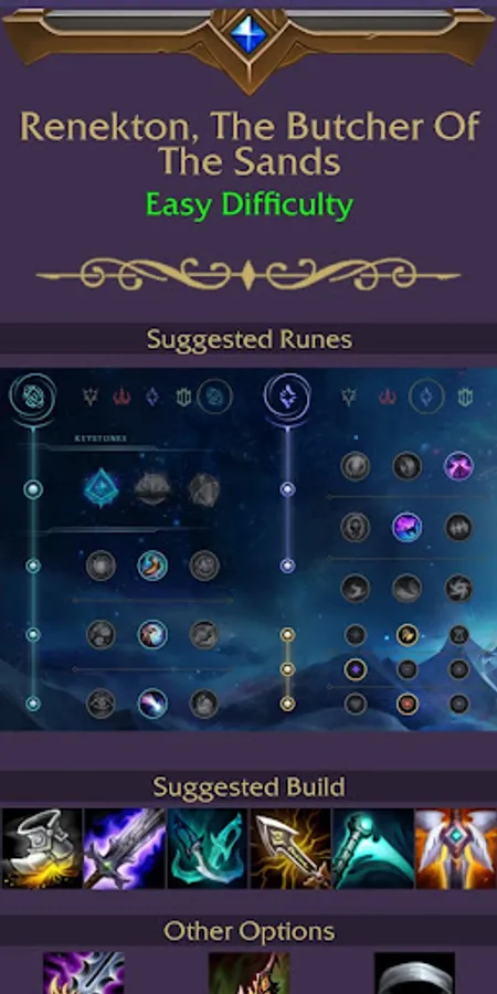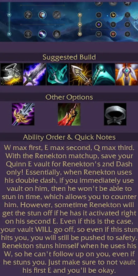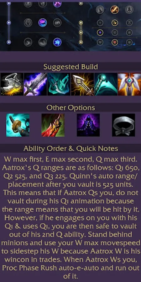 In the app you can find the suggested runes, item builds, ability order, matchup difficulty and even tips for every toplane Quinn matchup!