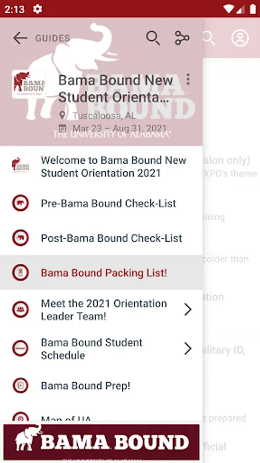 Bama Bound is an all-in-one app for your phone or tablet that allows users to access information on events such as Bama Bound New Student Orientation, University Days, and Sweet Home Capstone just to name a few.