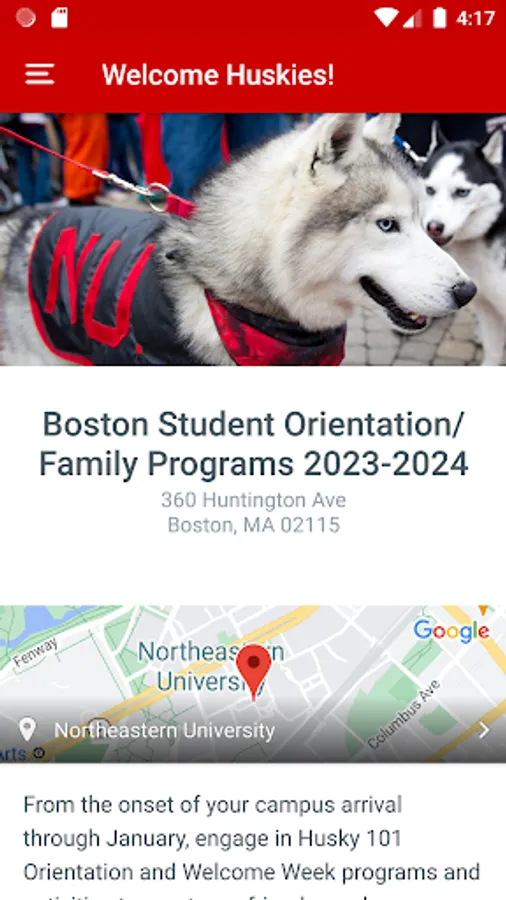 The Northeastern Student Orientation/Family Programs app is your guide to the new student and family transition onto the Boston campus. Access Student and Family Orientation, Welcome Week, and Family & Friends Weekend program schedules and resources.
